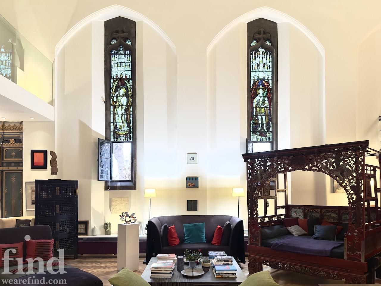 1908 Chapel converted into 2 reception rooms, 3 bedroom, 2 studies. The main central area has a 10 metre high ceiling. All the original features like the pulpit, reredos panelling, linen fold panelling, stained glass windows and an inlaid marble floor at the altar end have all been retained. In contrast, the additional mezzanine floor at the altar end and 2 mezzanines at the opposite end include several modern materials like clear glass, maple veneered panelling and highly polished stainless steel. The furniture is an eclectic mix including a dining table plus 2 decorative chairs and a desk designed by Mark Brazier Jones. Most of the remaining furniture was designed by the owner.