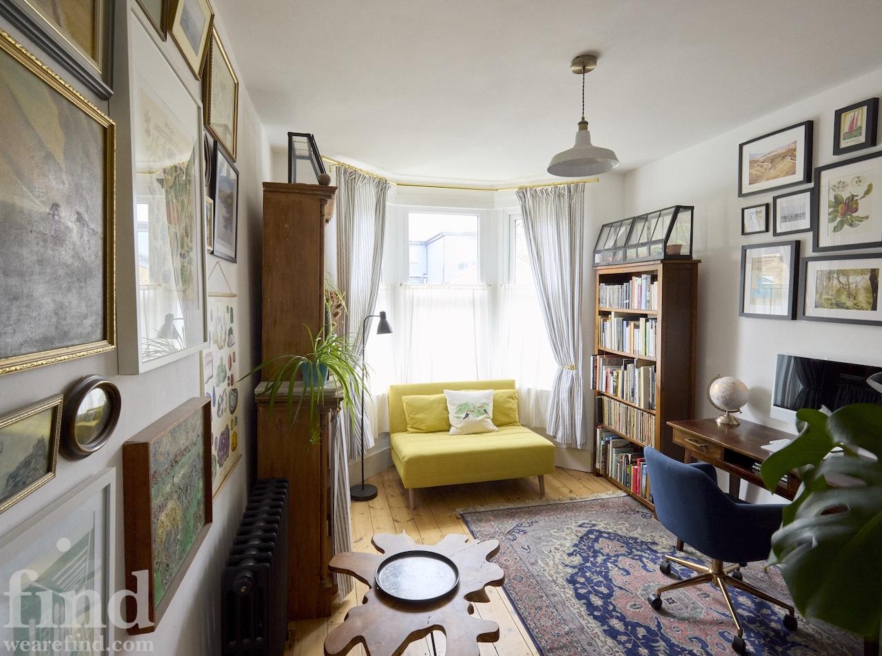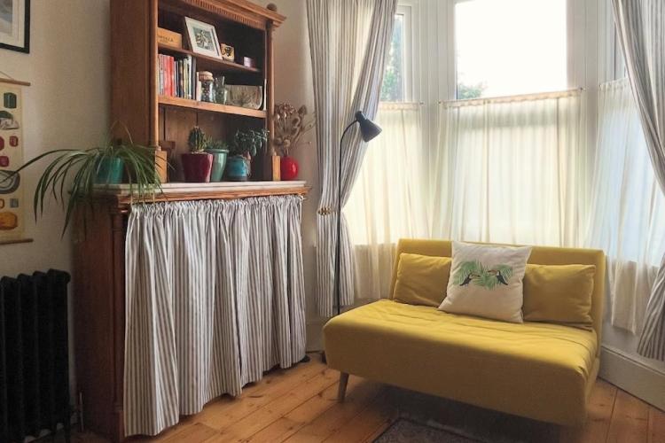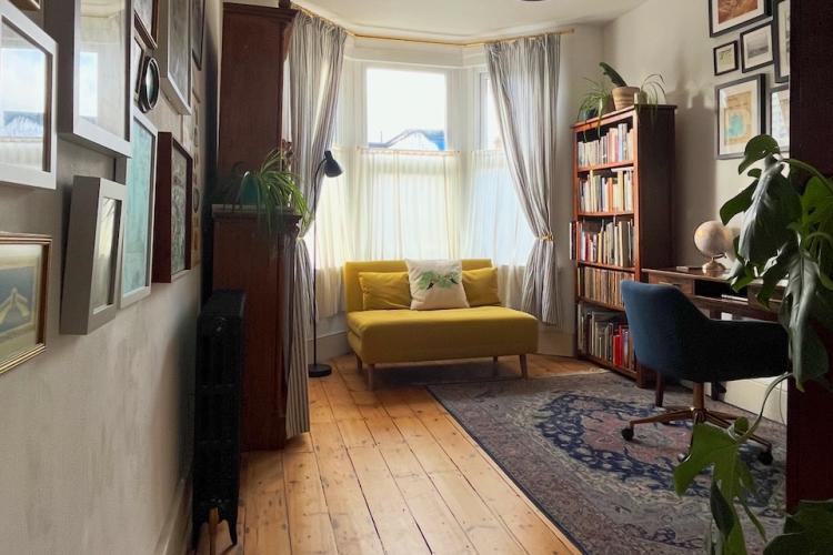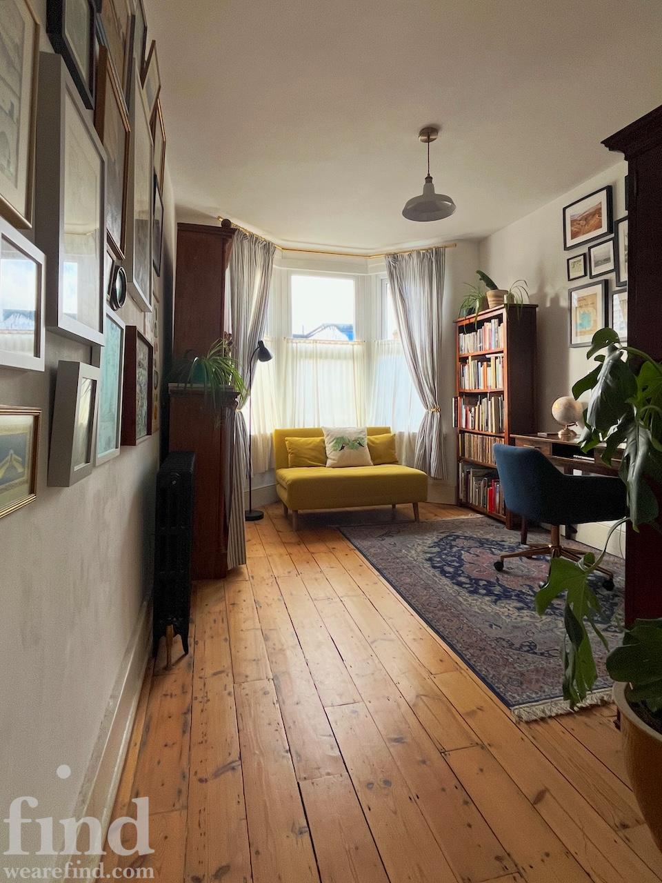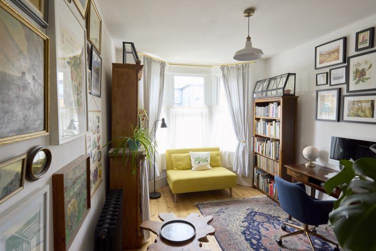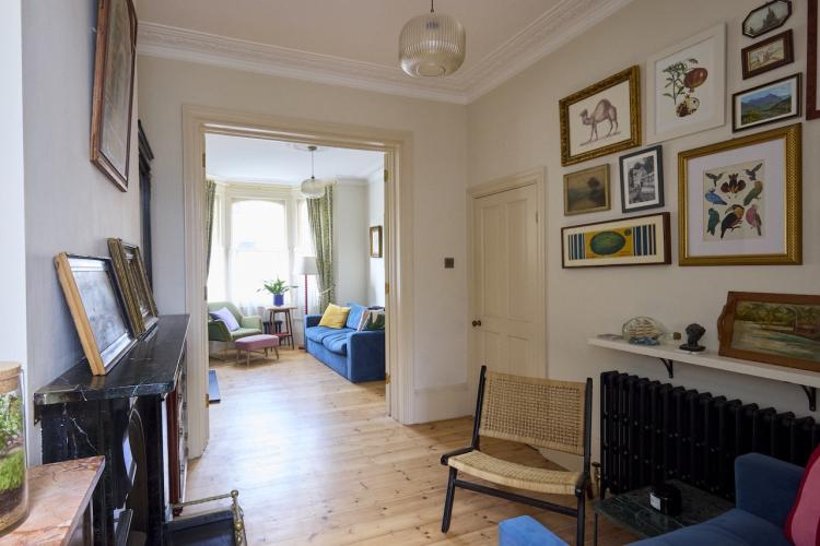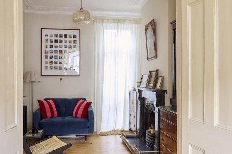 The adjoining, bay fronted sitting rooms have tons of light from the restored sash windows as well as the restored original pine floorboards which run throughout the house. There are double dividing doors between the two rooms, built in bookshelves, linen cafe curtains and airy high ceilings. Upstairs the bathroom has tiled marble floors and walls, a roll top bath with shower and Victorian style fixtures. There are plenty of plants there, and throughout the house. The generous master bedroom also has a bay window with original wooden sashes, full length William Morris curtains and several more pieces of antique furniture. Beautiful and comfortable additional spaces can be found in the middle guest room and attic space, which has an additional shower and toilet facilities. The study, which is south facing, also has its own bay window and cafe curtains.