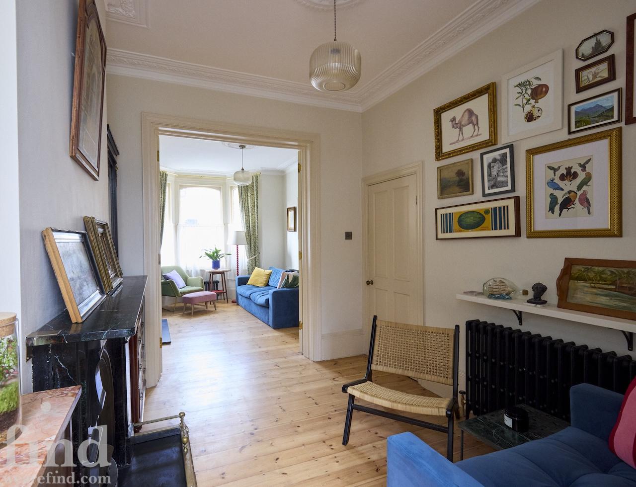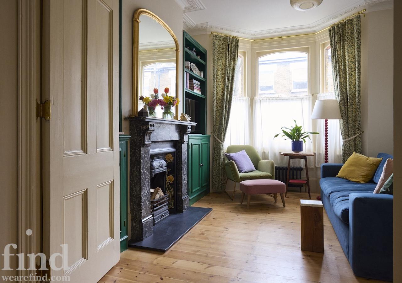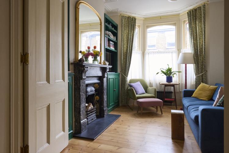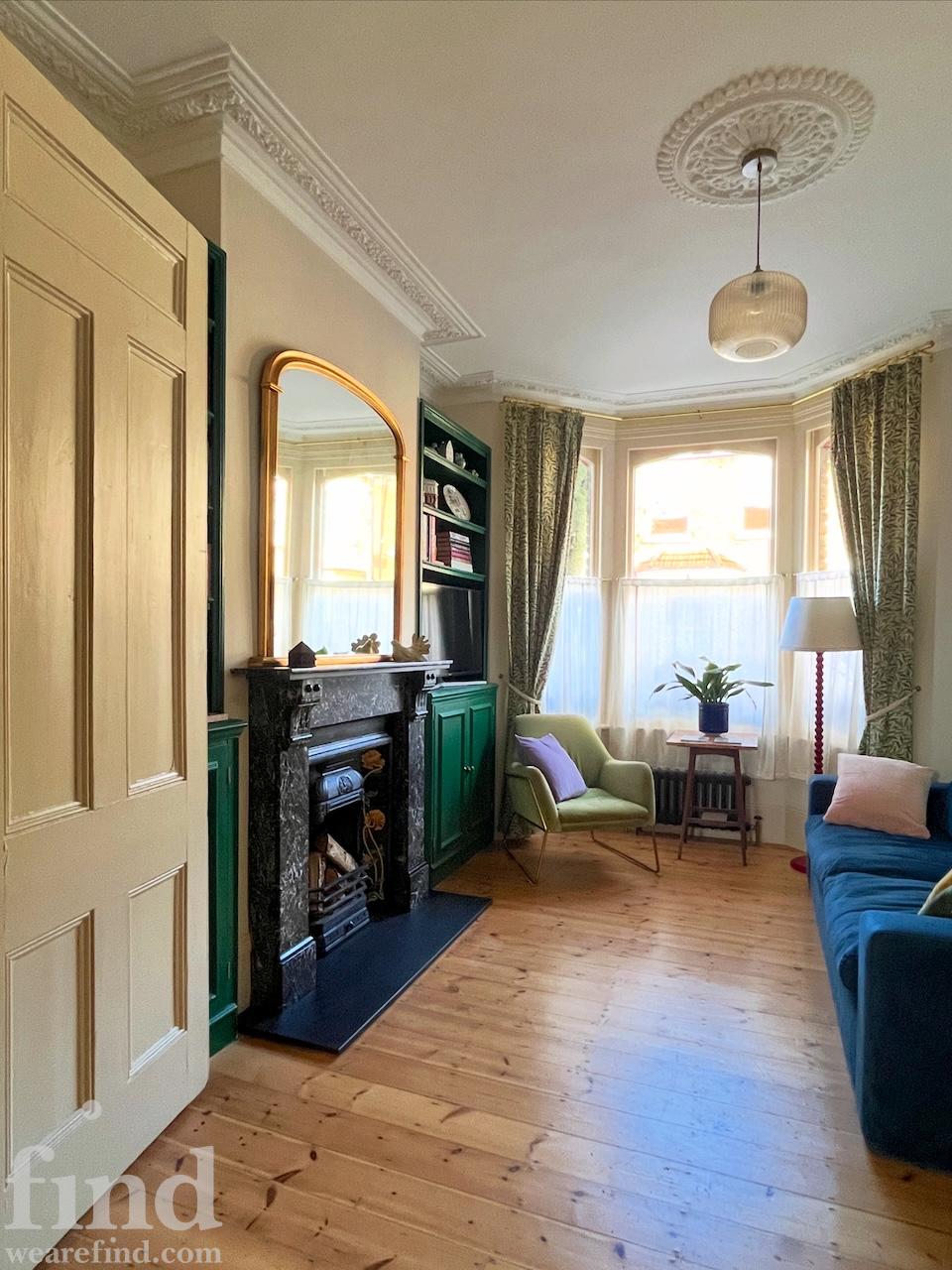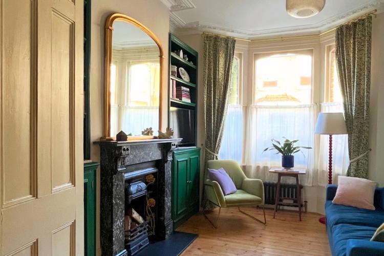 A beautiful, bright house in east London built in 1880 and tastefully restored to retain Victorian features throughout. As you enter you will see the beautiful porch tiled in majolica and the front door with intricate stained glass. There is a large kitchen diner with antique furniture and plenty of vintage cookware and tableware options. The centrepiece is the 5 burner, twin oven Lofra range, which sits opposite the vintage wooden and granite island. The floor is made of solid marble tiles and the surfaces are Rosa Portogallo marble. Solid wood cabinetry in matte Little Greene ‘Arsenic’ paint and there is ‘Setting Plaster’ on the walls.
