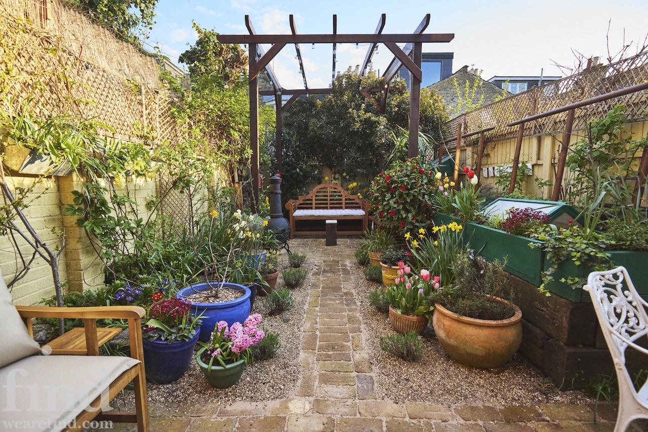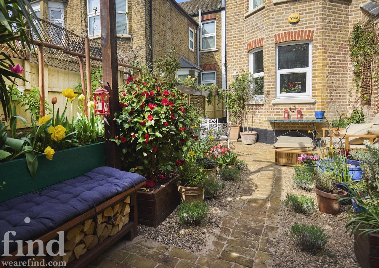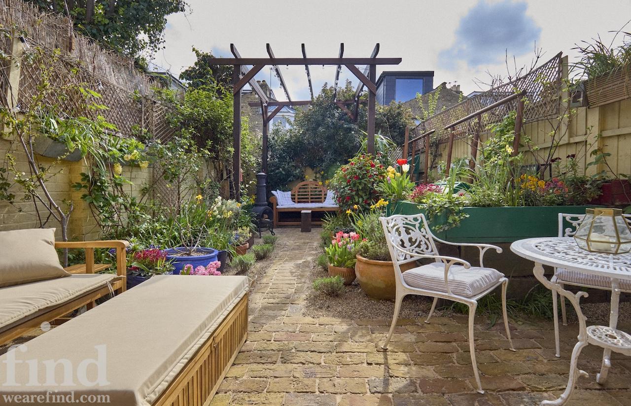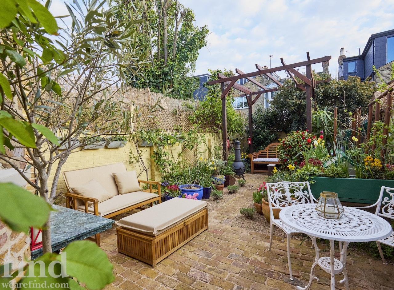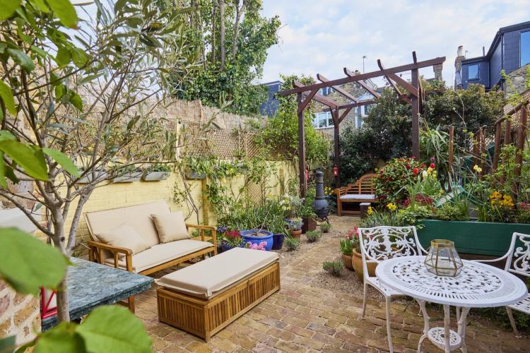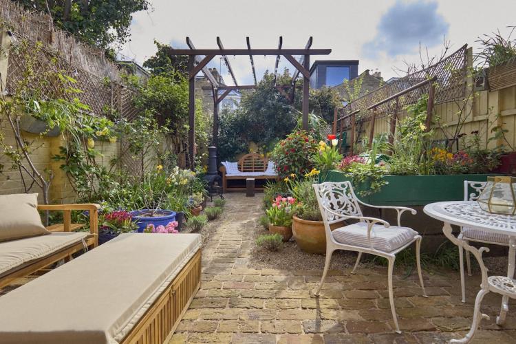 There are new cast iron radiators throughout the house, which has just been completely re-wired too. Two bay windows and a glass door look out from the dining room onto the lovely south facing, cottage style garden which has walls on two sides. It has a reclaimed London Stock brick patio, grass lawn and raised beds which are full of flowers, vines, fruits and vegetables from spring through to autumn. There is a beautiful wrought iron garden furniture set and a wooden bench too.