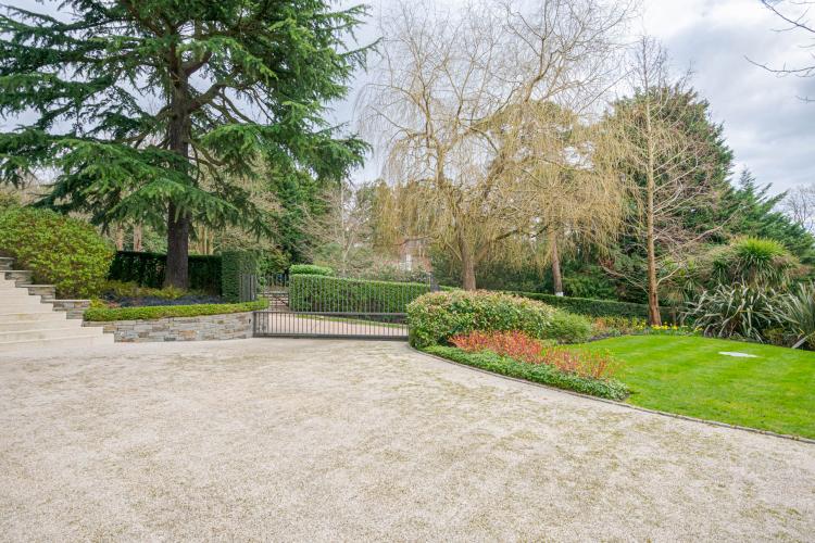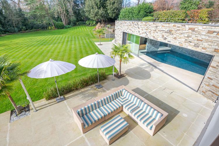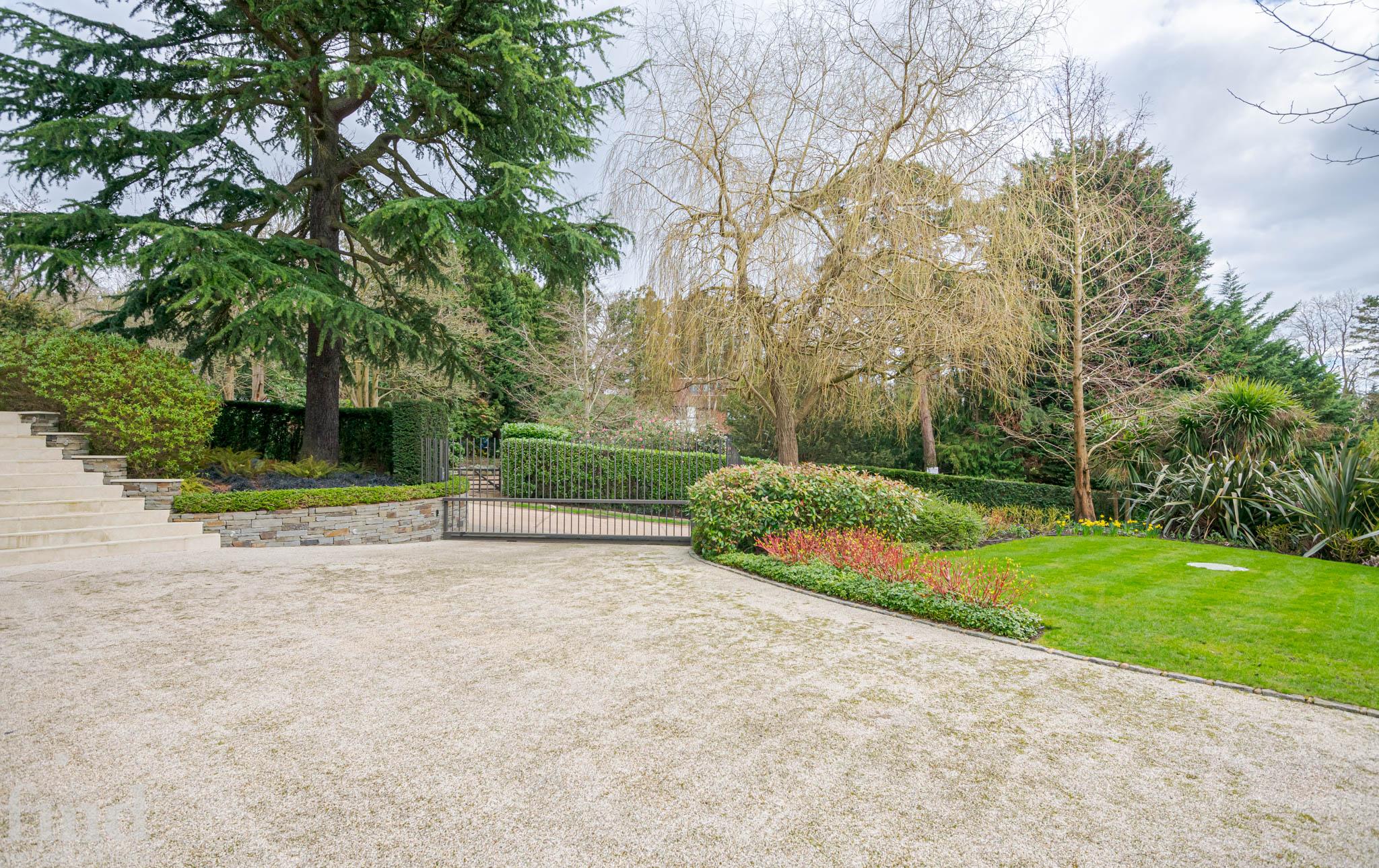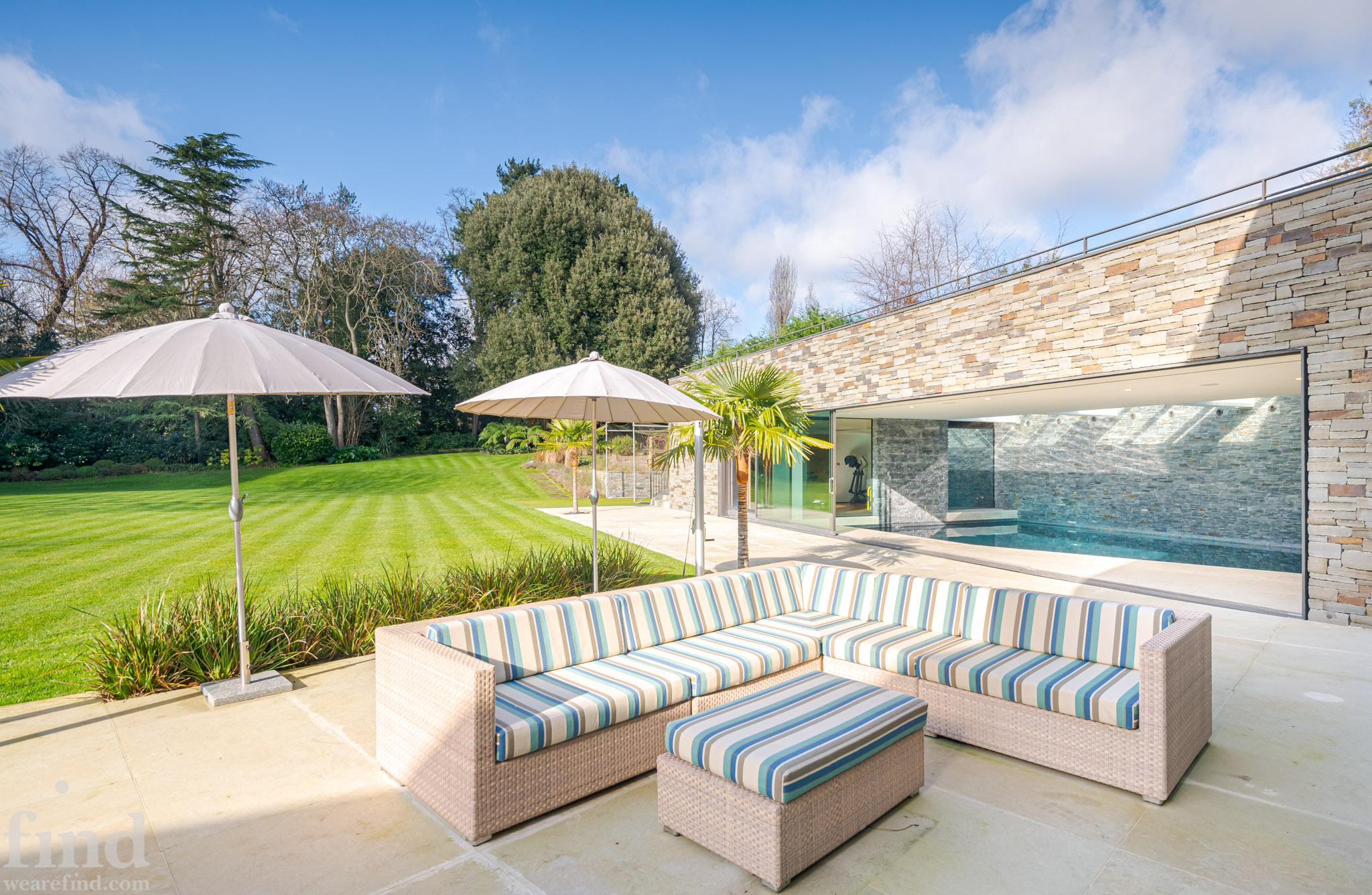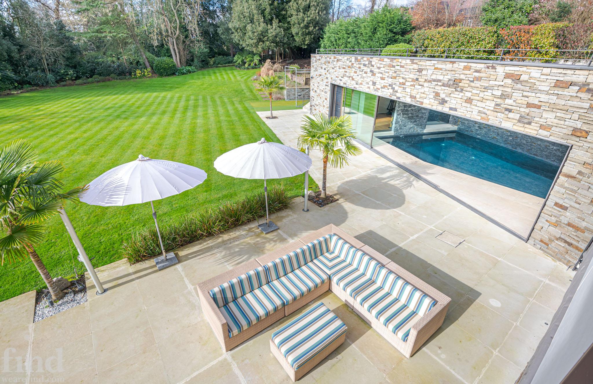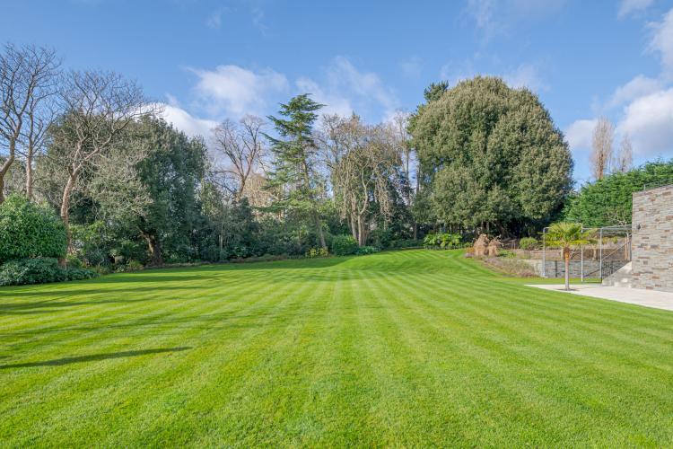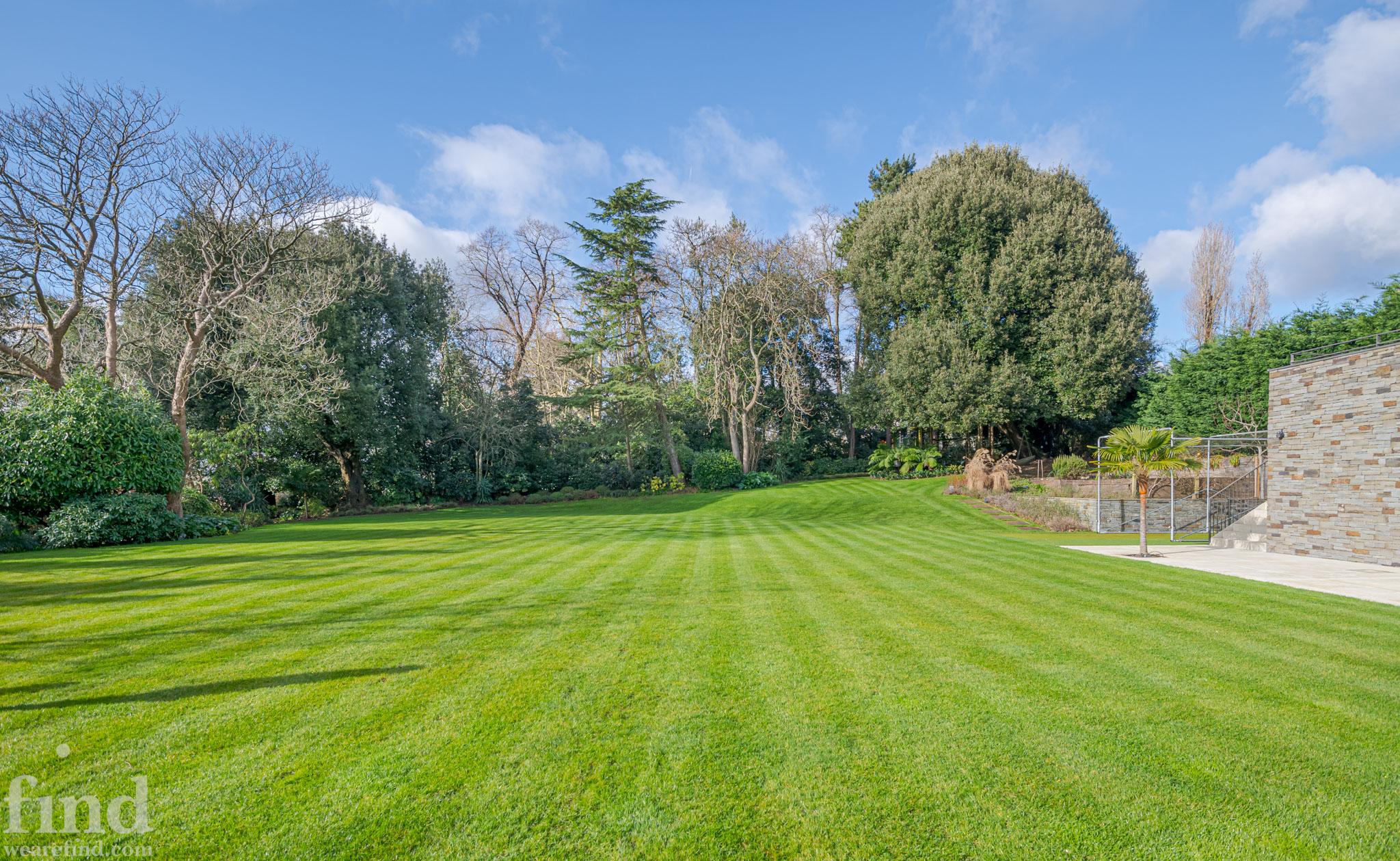 Huge garden with outdoor seating and surrounding path