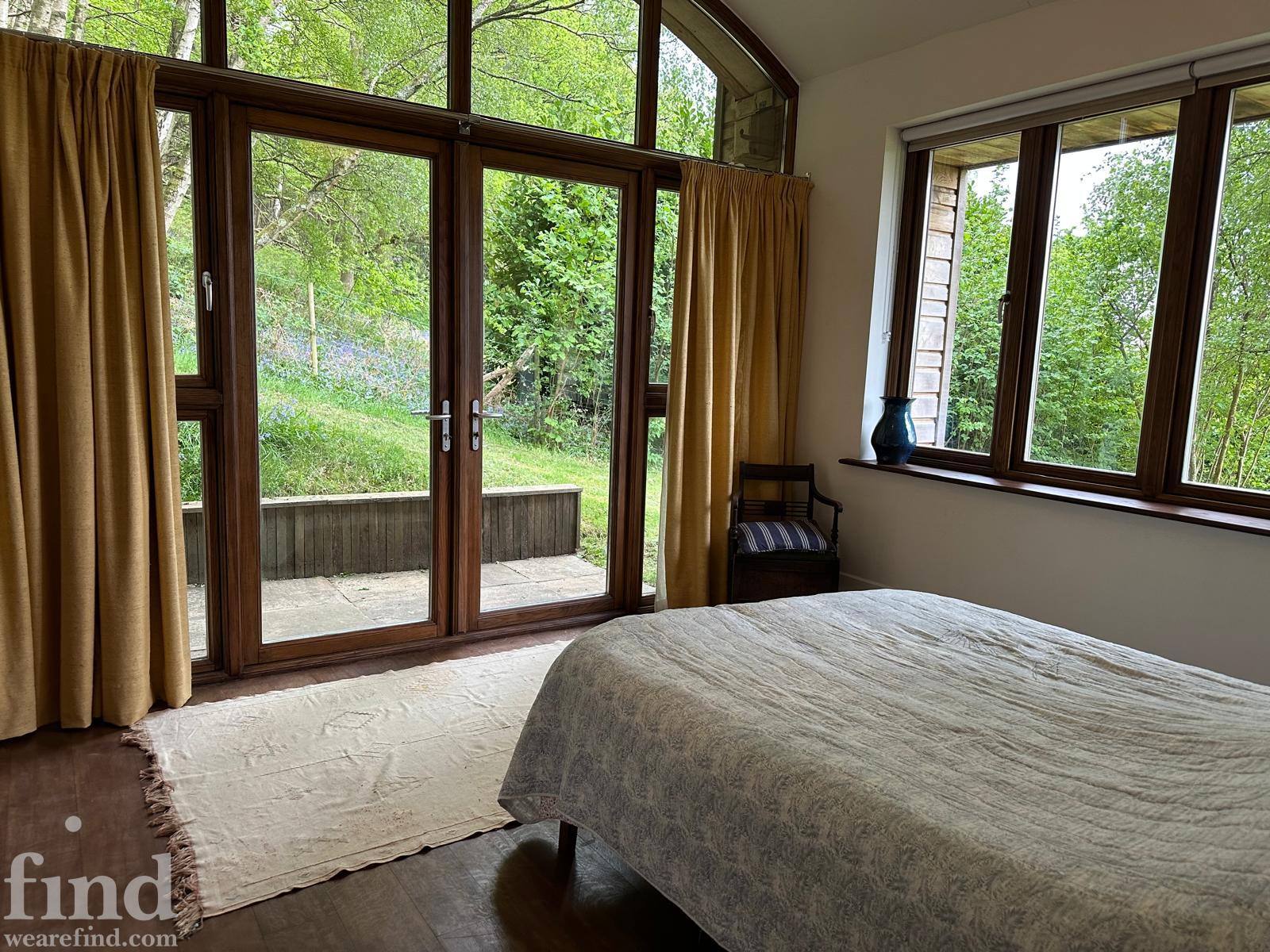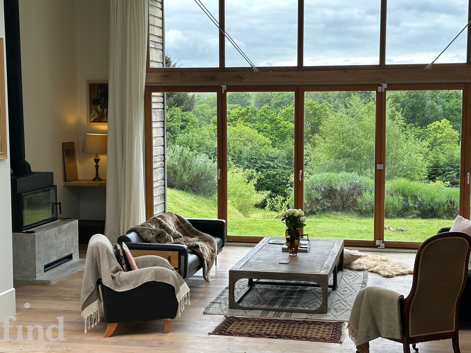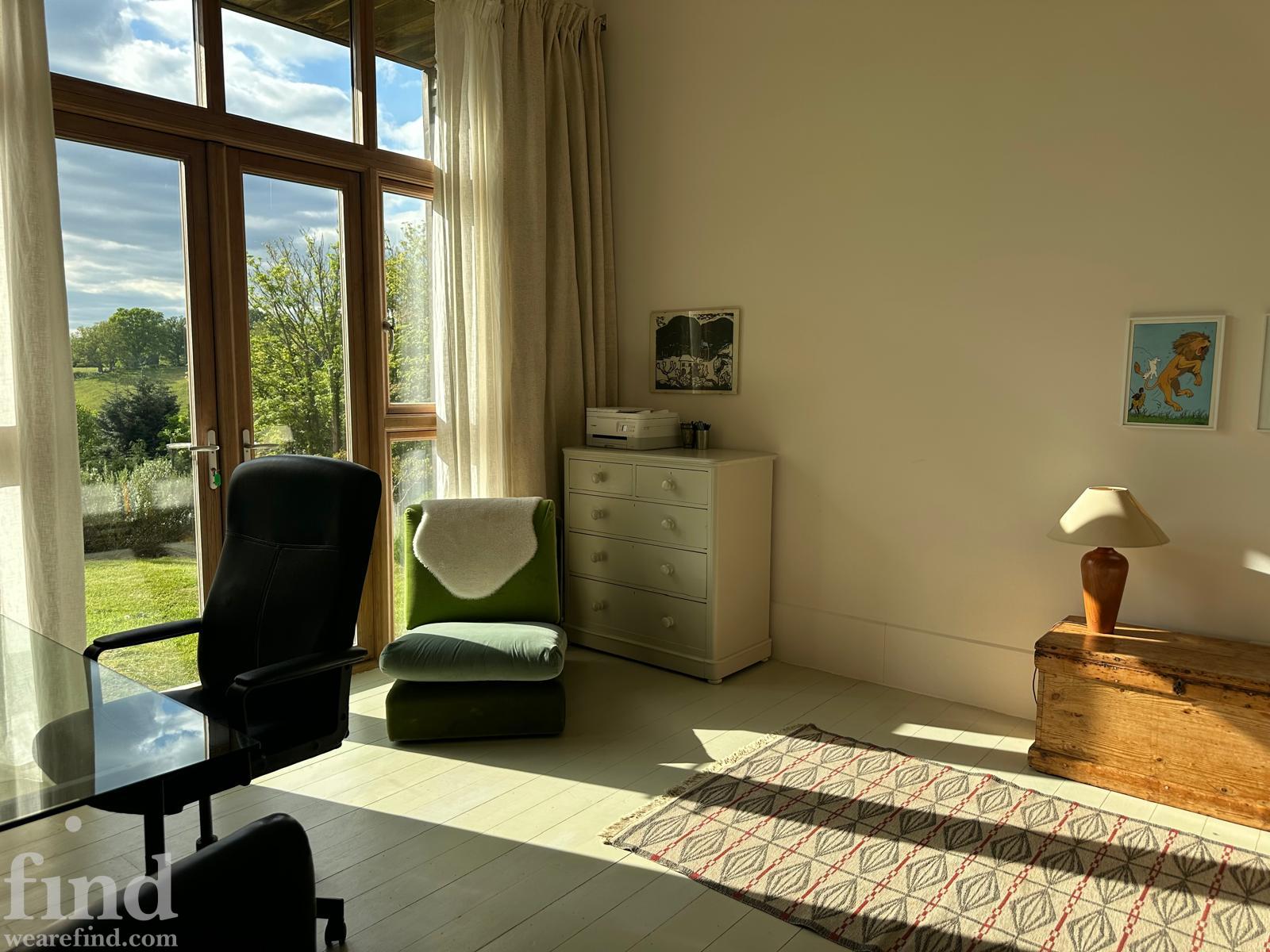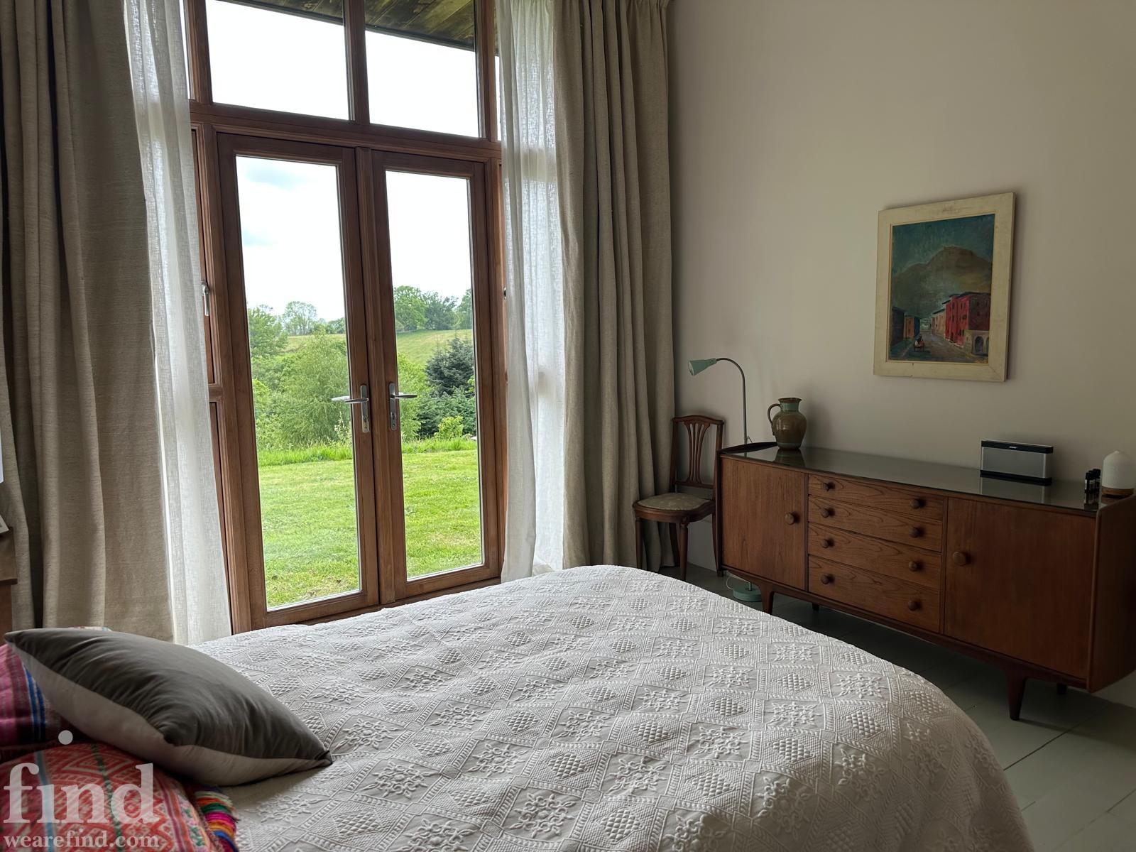 Each bedroom opens directly onto the garden, enabling seamless interior-to-exterior transitions for filming. The surrounding grounds include terraces, lawns, wild meadow areas, woodland edges and long, open views.