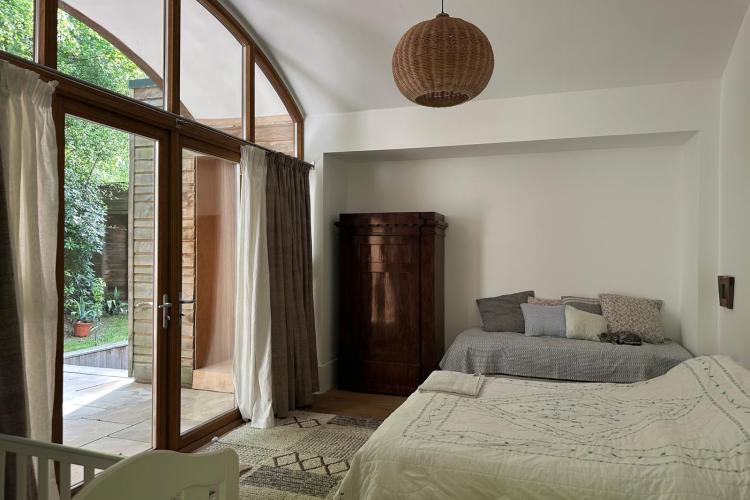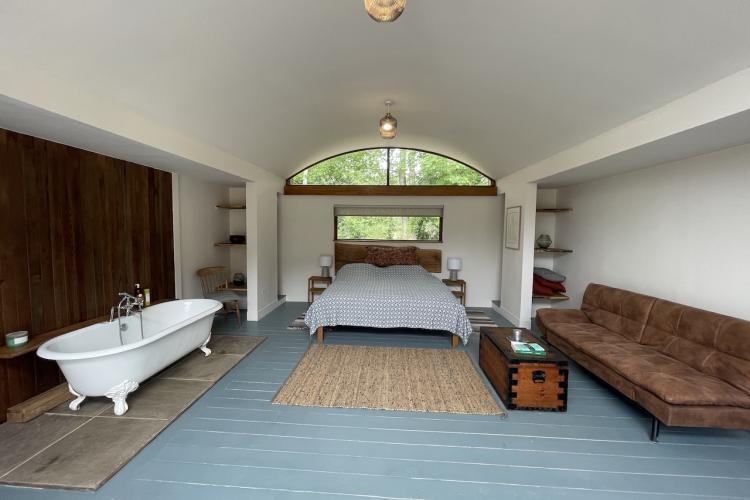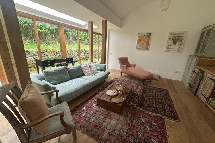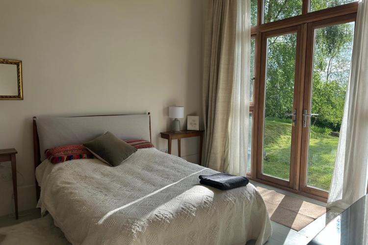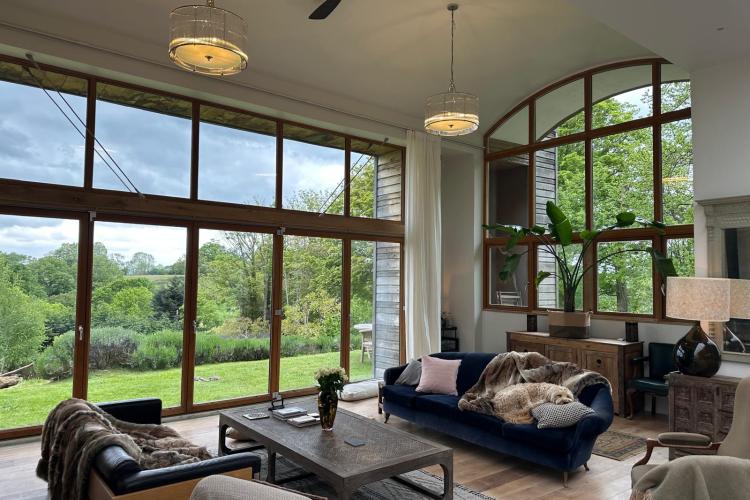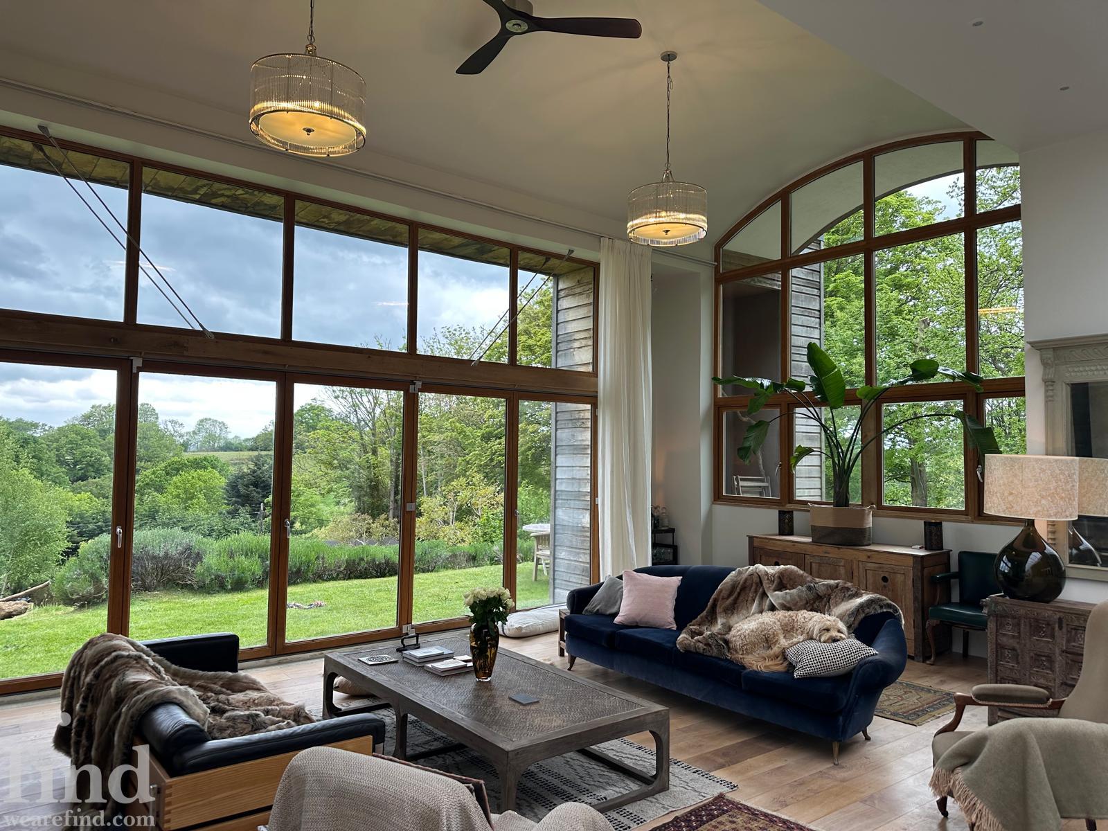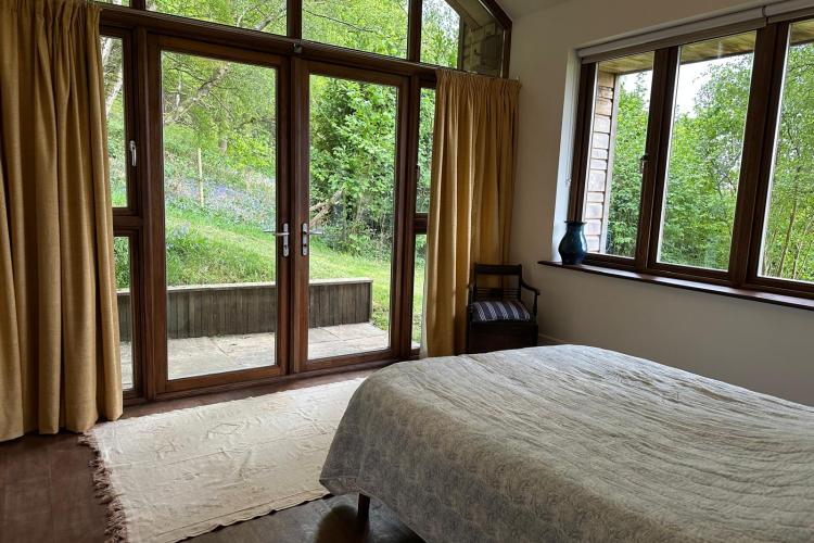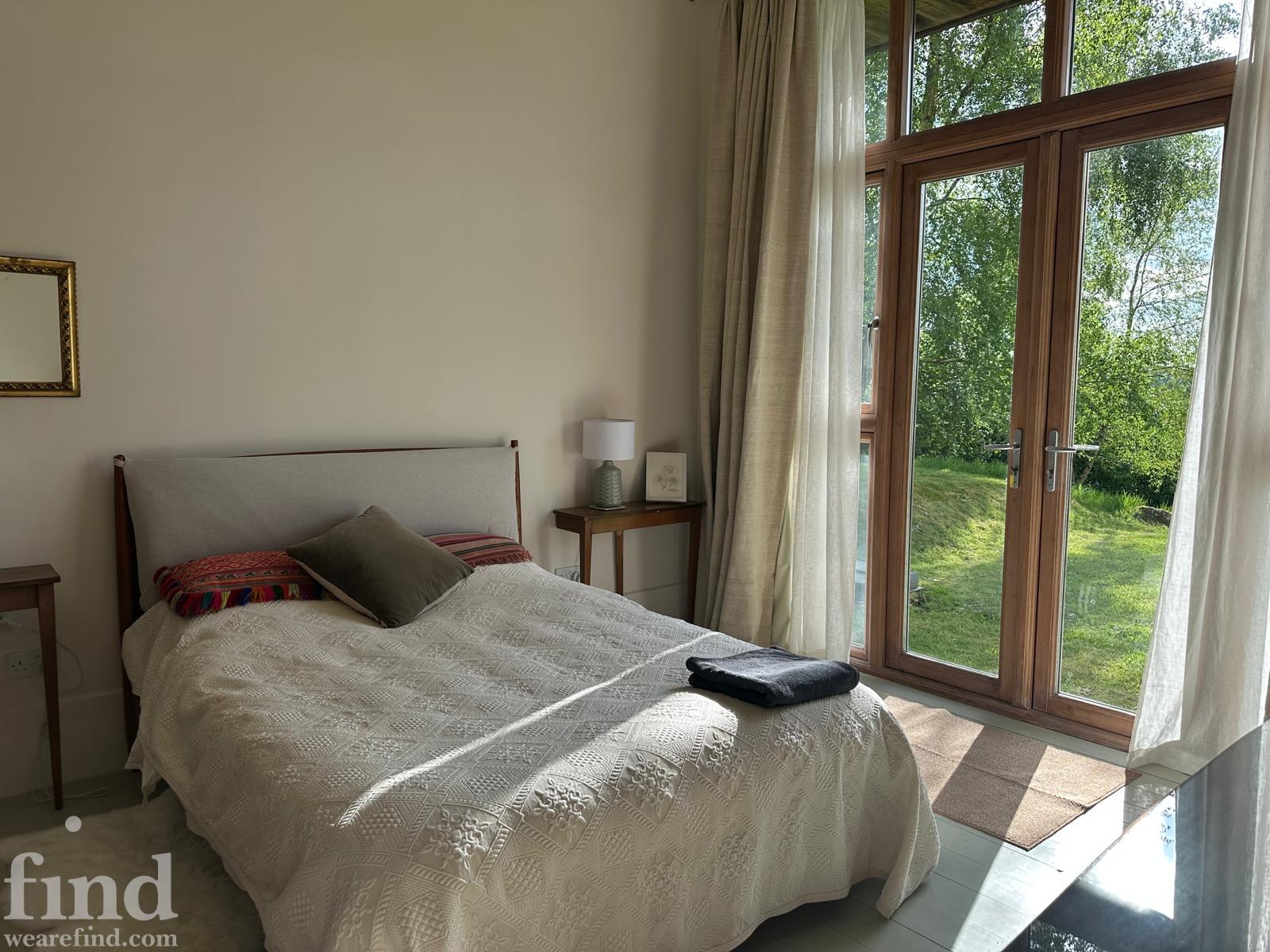 Each bedroom opens directly onto the garden, enabling seamless interior-to-exterior transitions for filming. The surrounding grounds include terraces, lawns, wild meadow areas, woodland edges and long, open views.