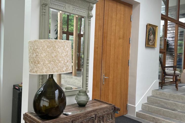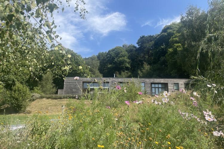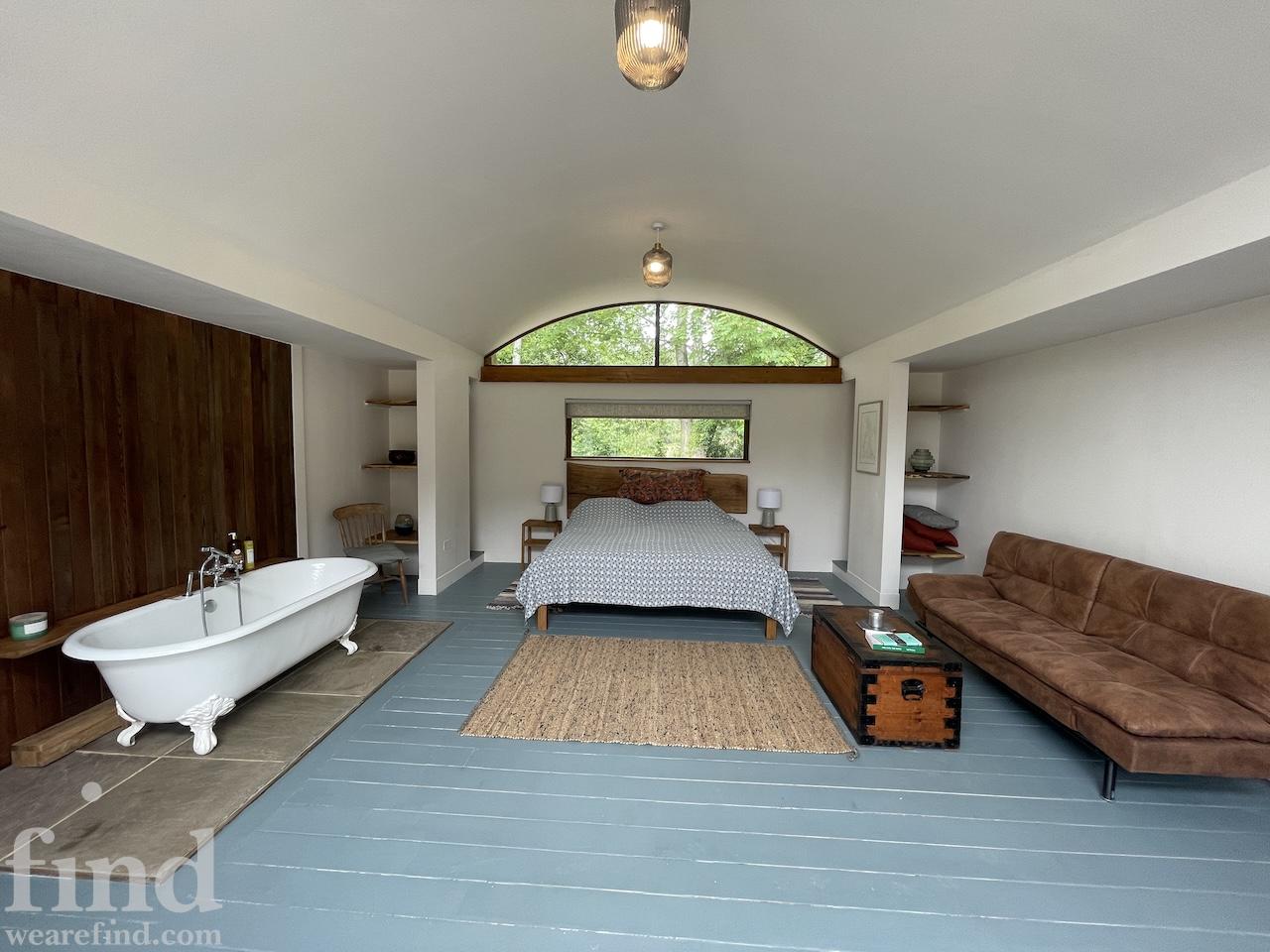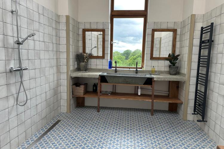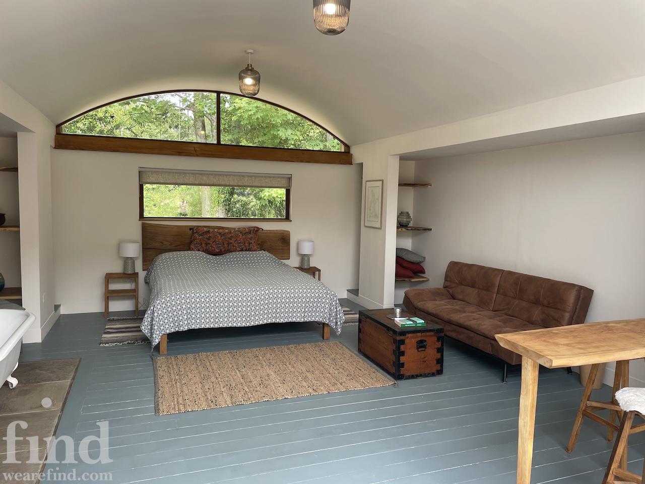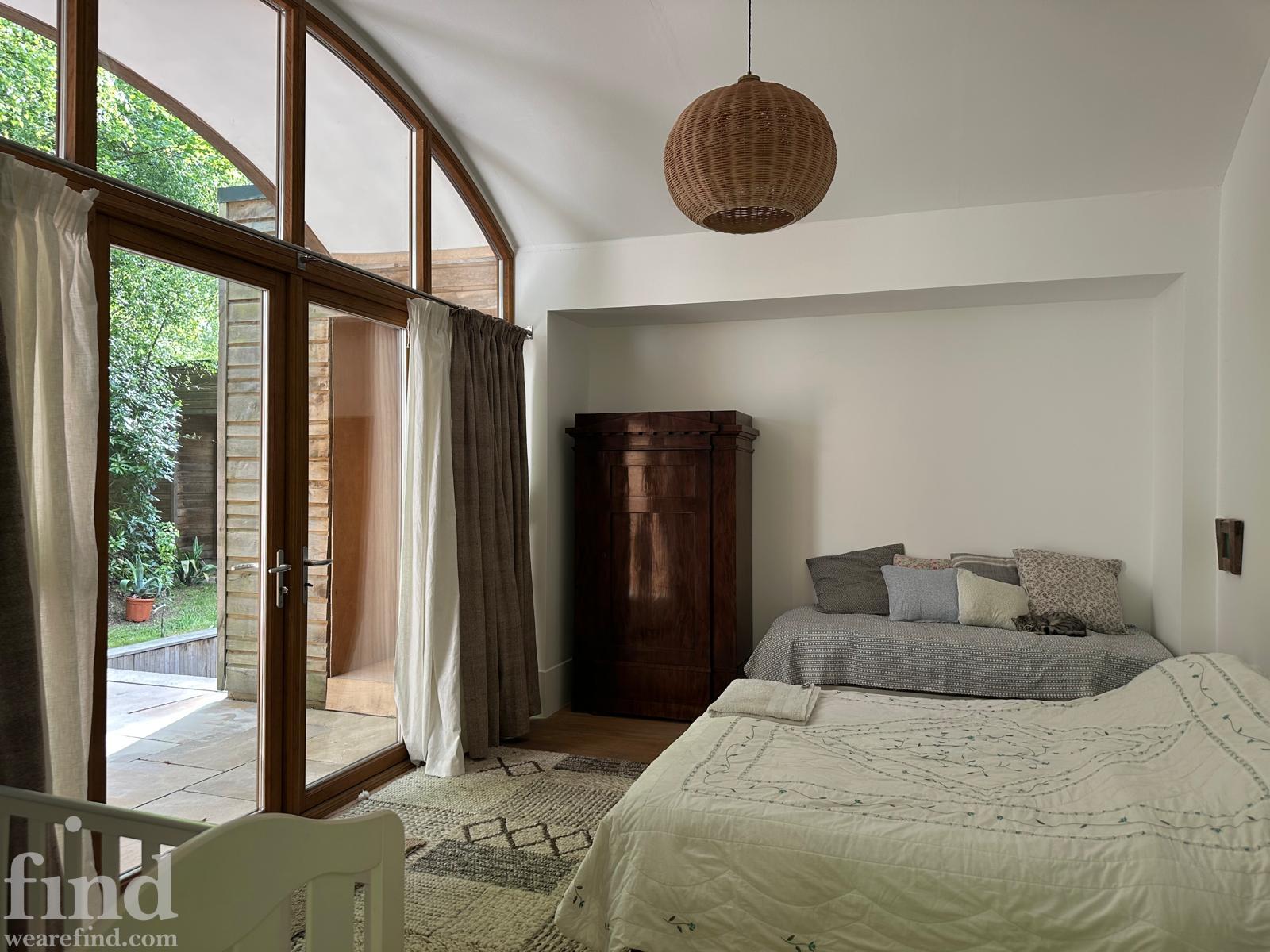 Each bedroom opens directly onto the garden, enabling seamless interior-to-exterior transitions for filming. The surrounding grounds include terraces, lawns, wild meadow areas, woodland edges and long, open views.