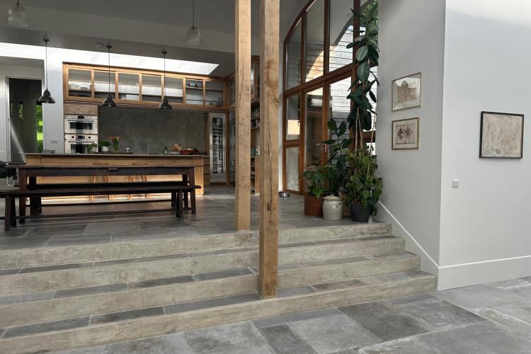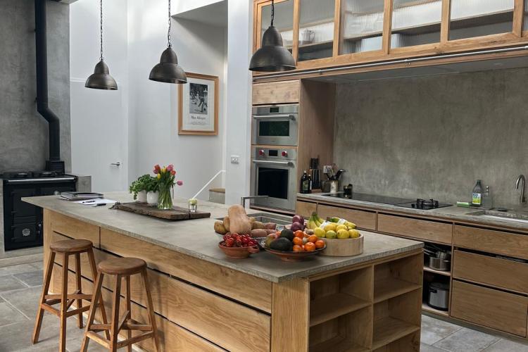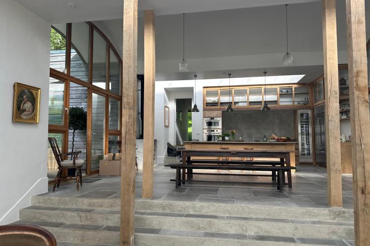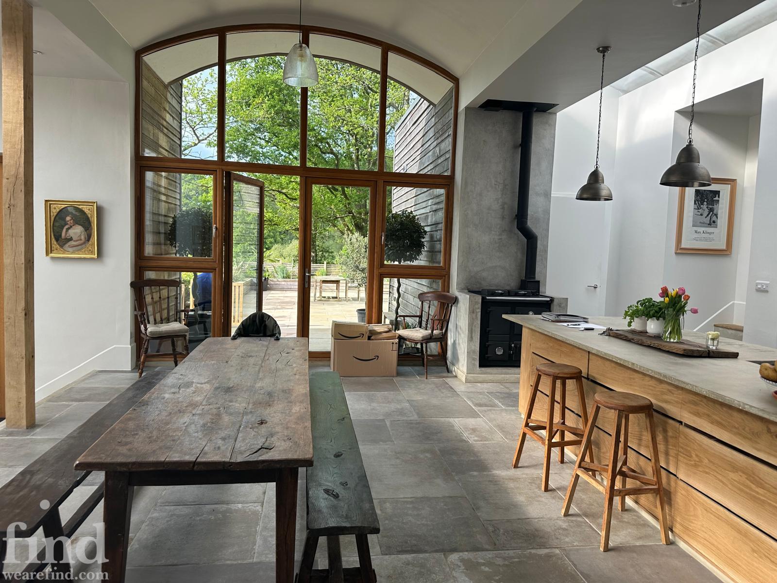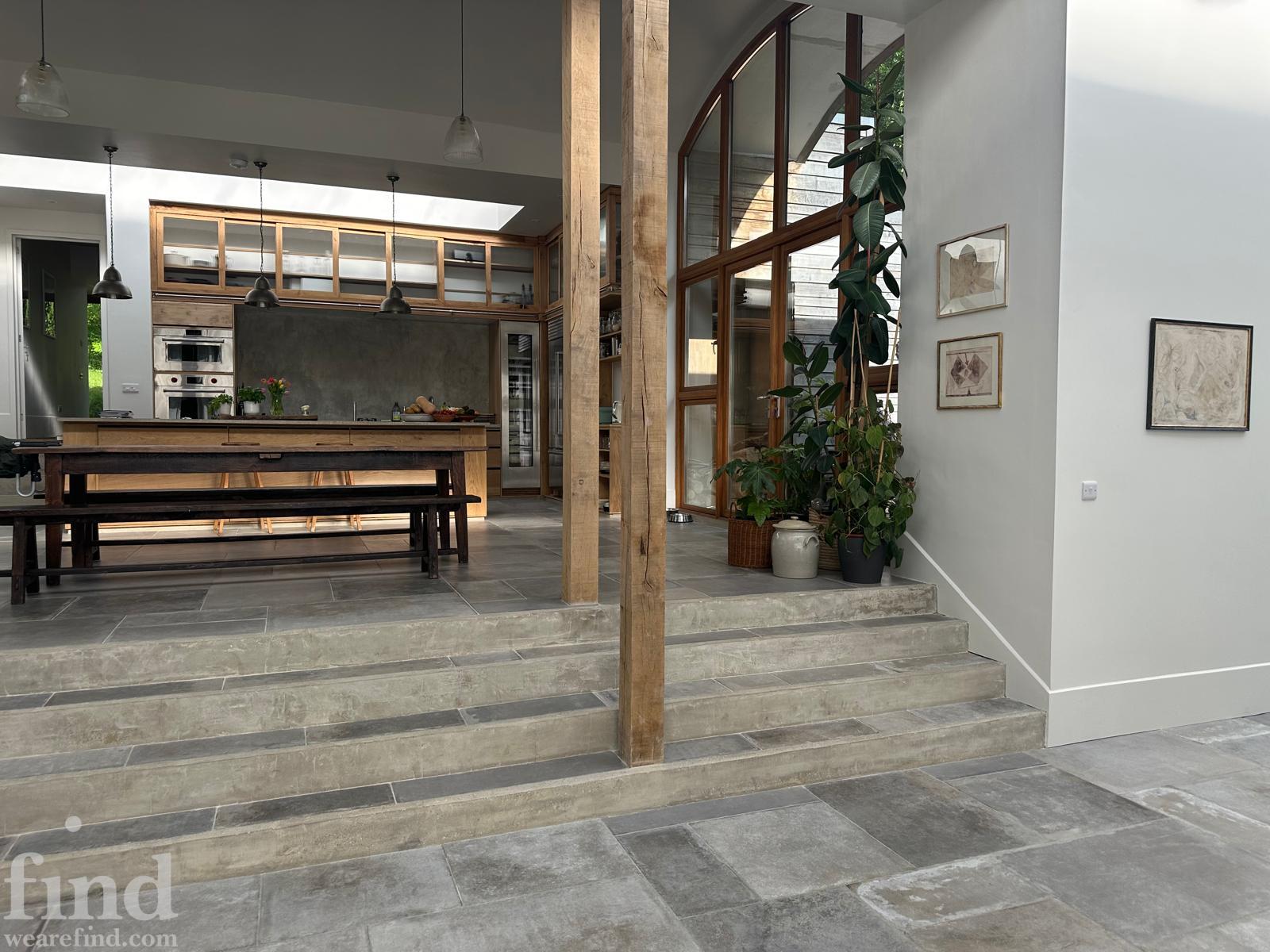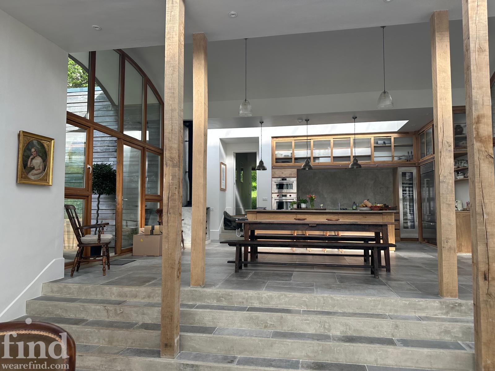 The interior is defined by volume, natural materials and an exceptional connection to the landscape. Full-height glazing, arched openings and skylights flood the house with daylight throughout the day, while carefully considered levels create a natural flow between living, dining and private spaces.