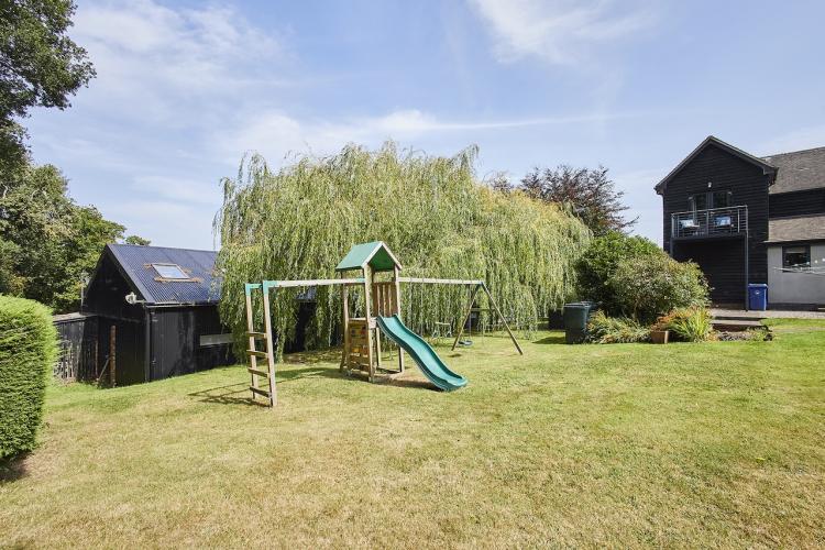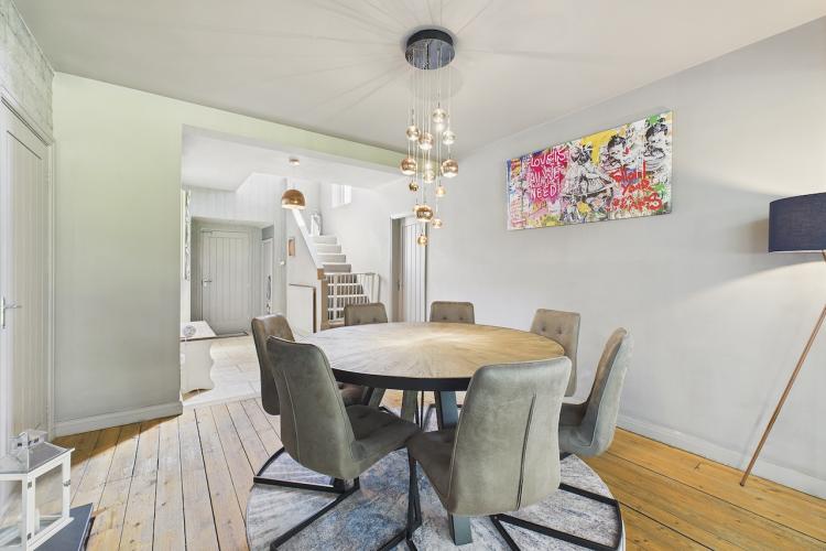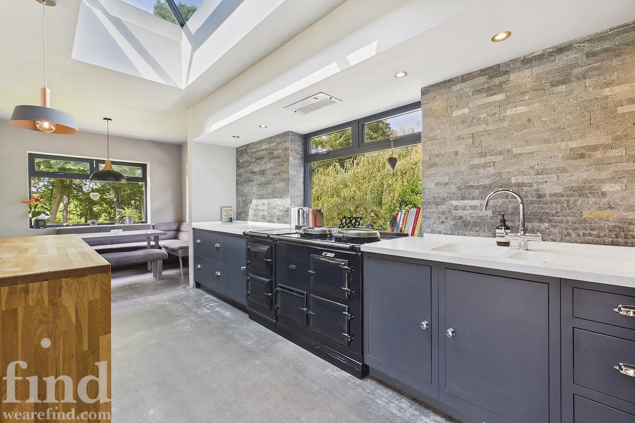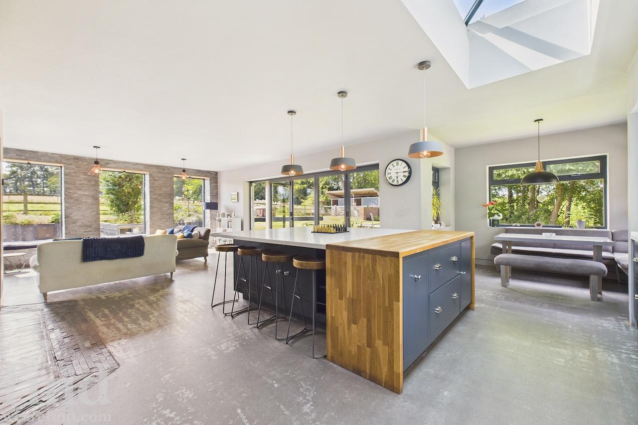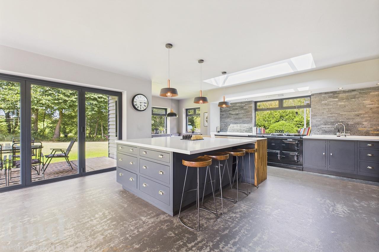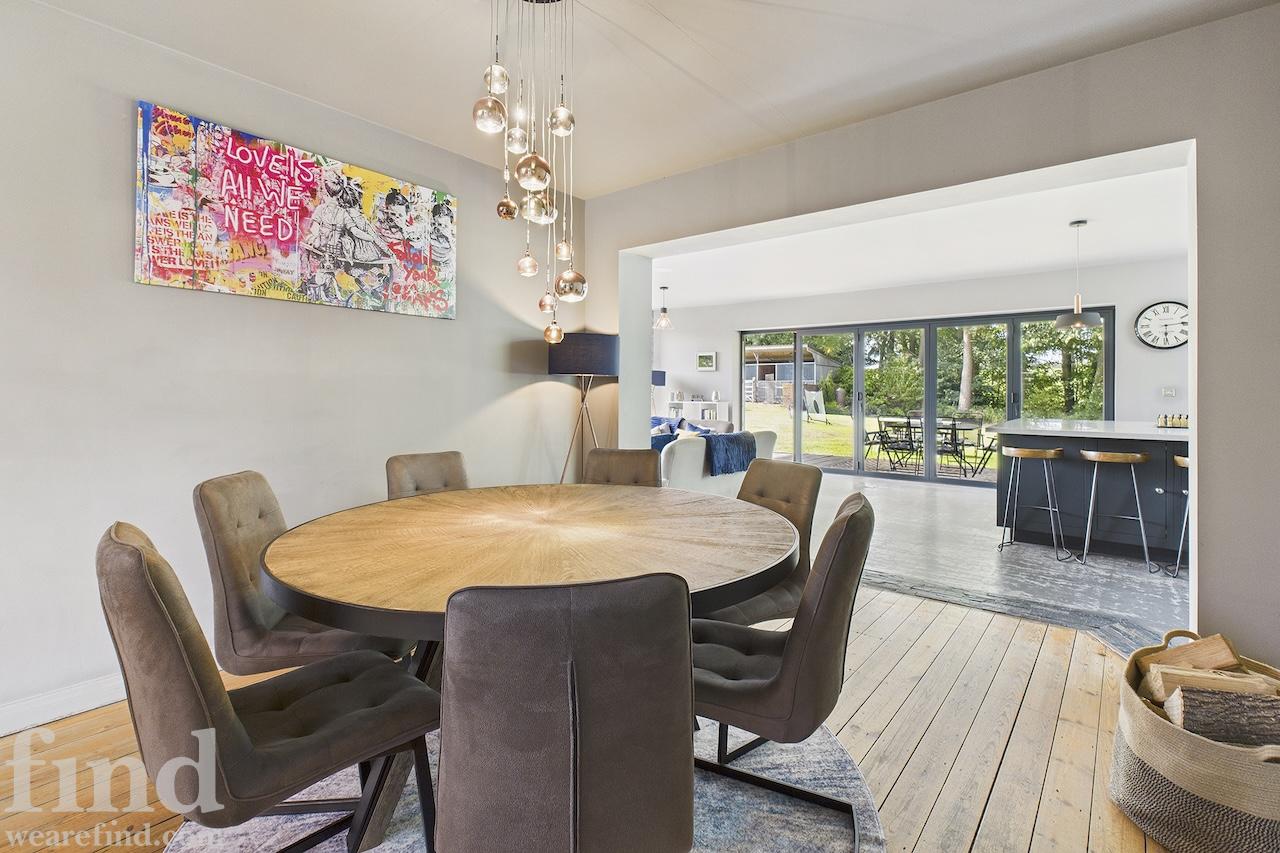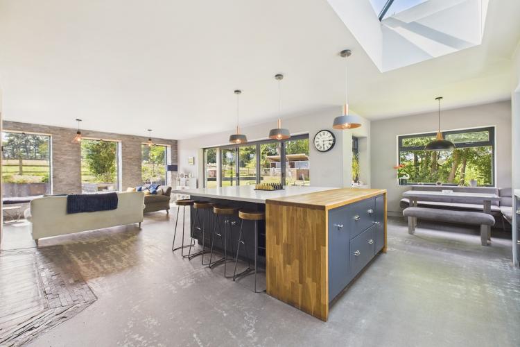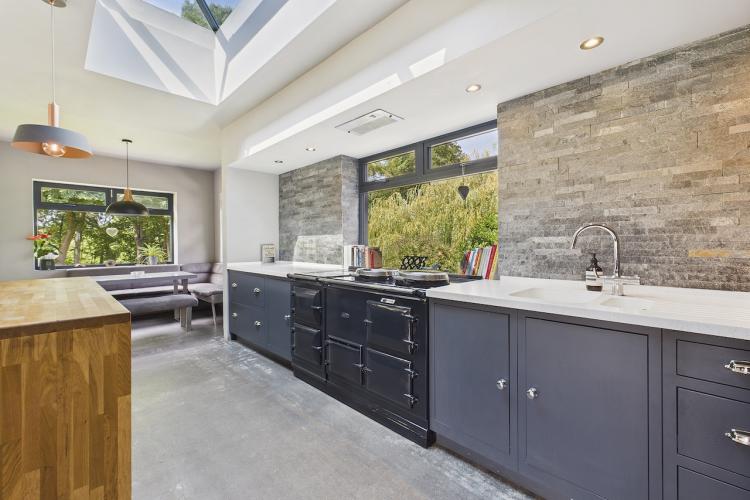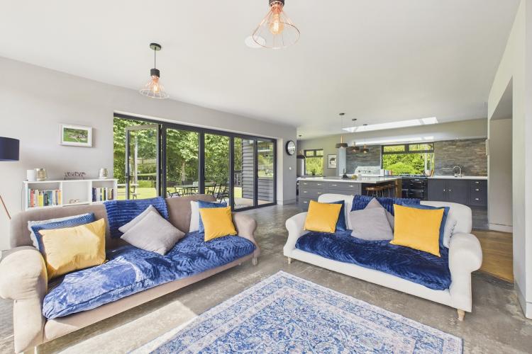 A well-equipped open plan kitchen and dining area. The bi-fold doors in the kitchen lead outside to the enclosed wrap-around garden. That offers a patio, lawn, and climbing frame and forest views. The dining room features a woodburning stove.