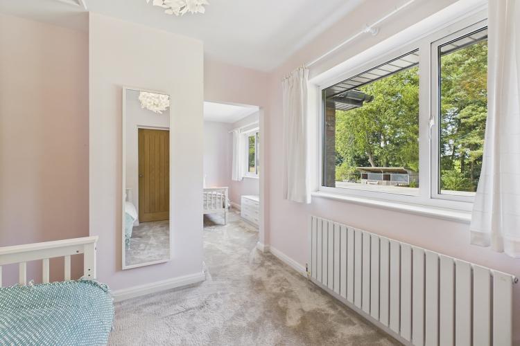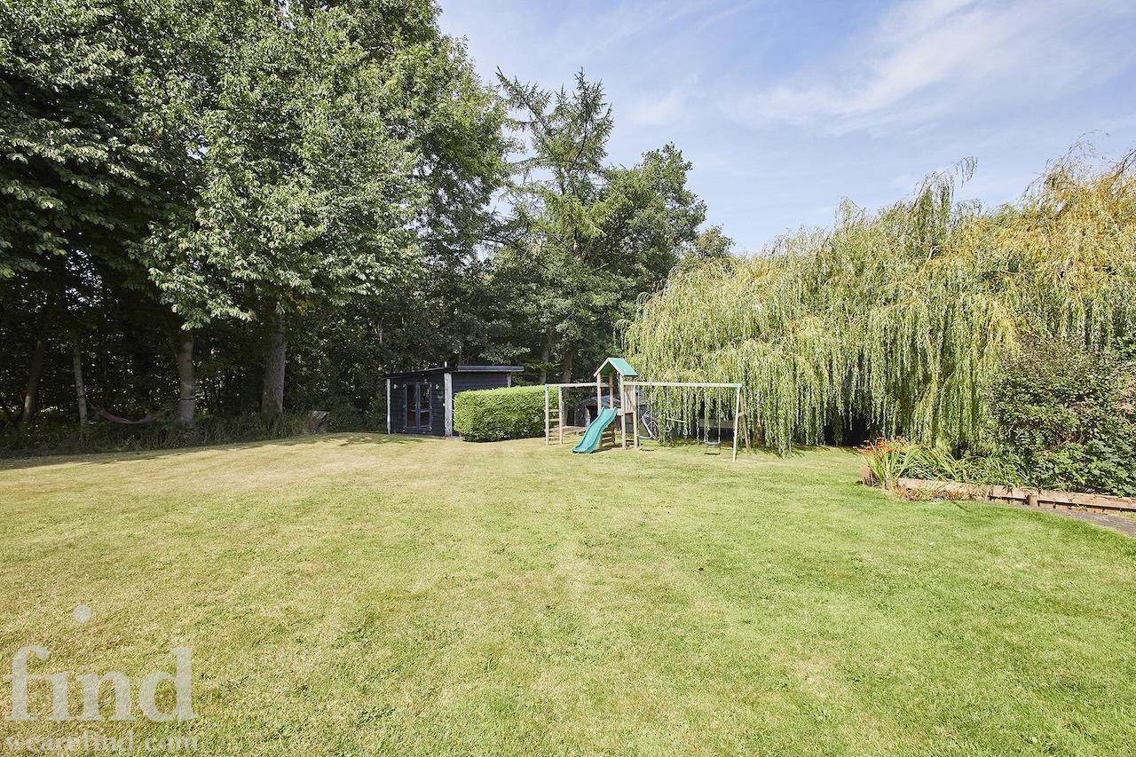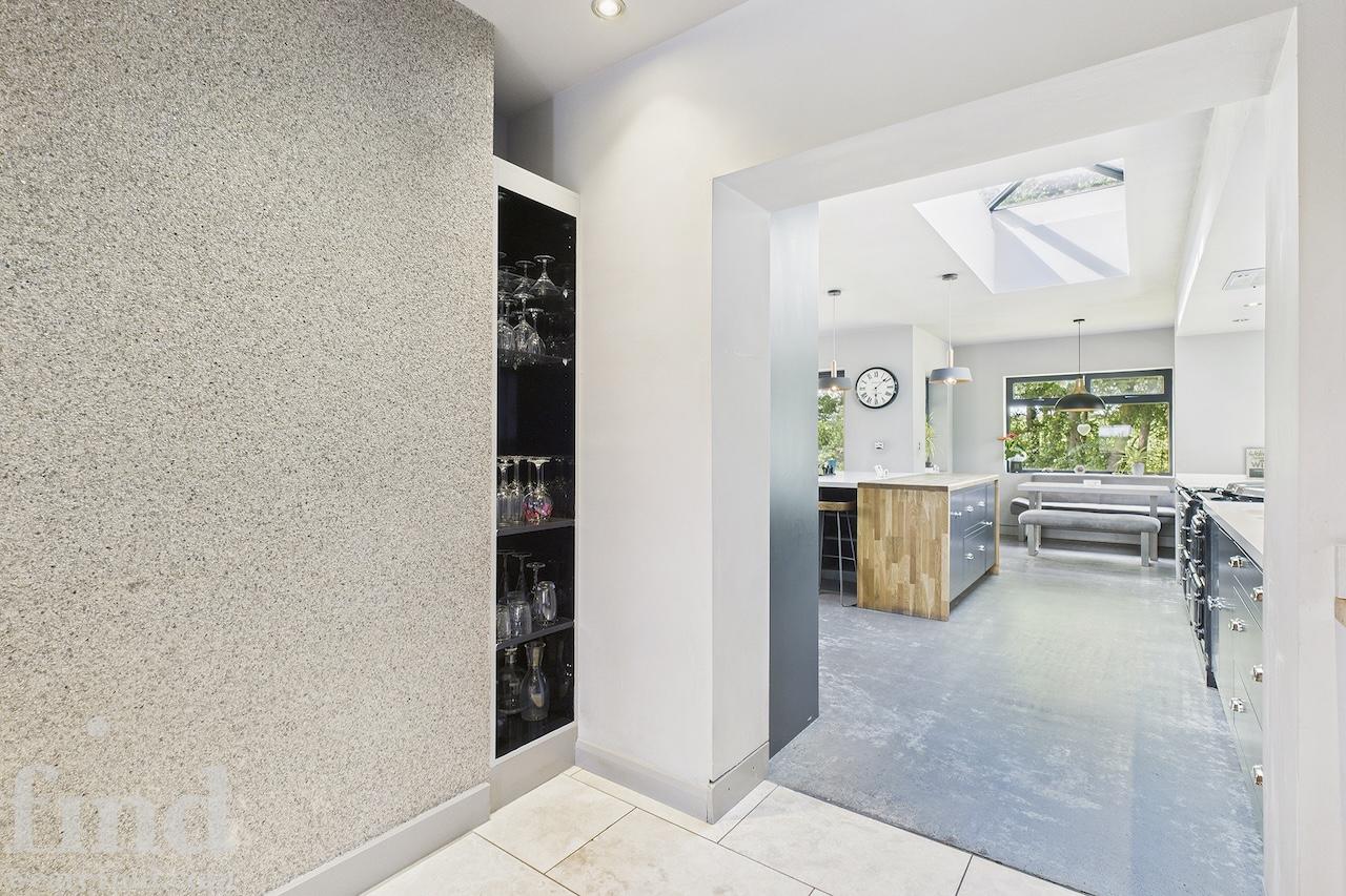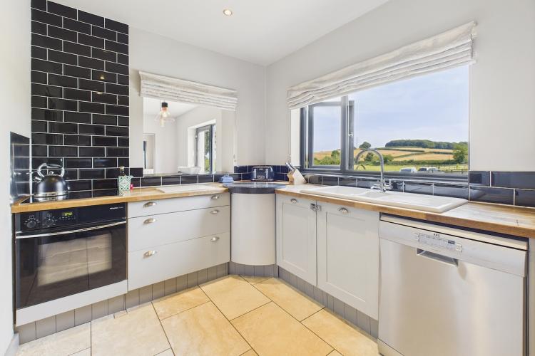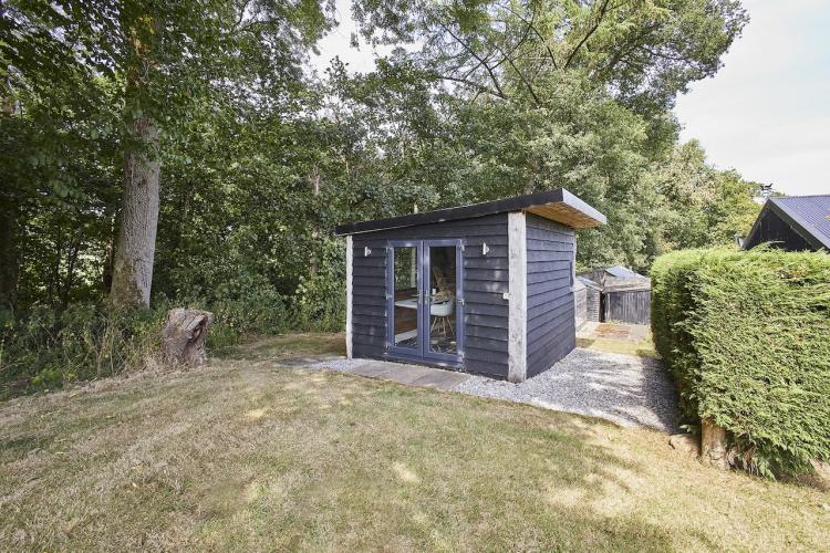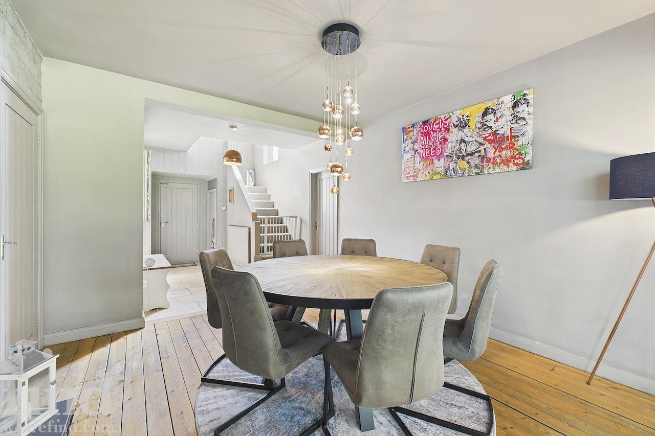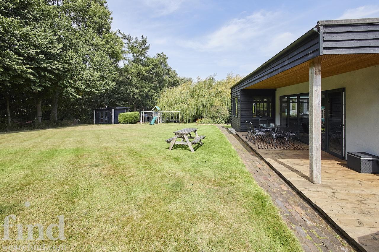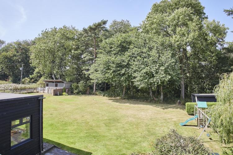 A well-equipped open plan kitchen and dining area. The bi-fold doors in the kitchen lead outside to the enclosed wrap-around garden. That offers a patio, lawn, and climbing frame and forest views. The dining room features a woodburning stove.