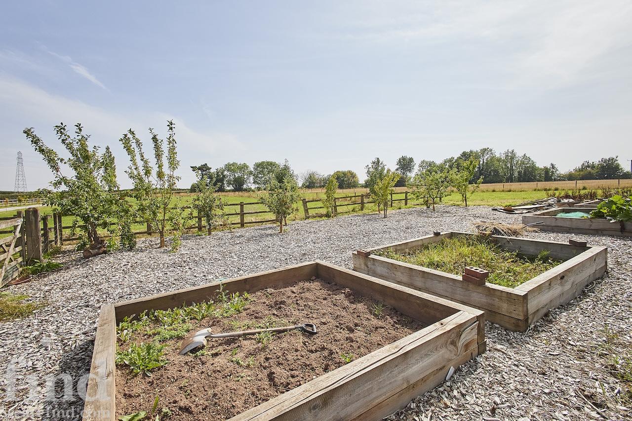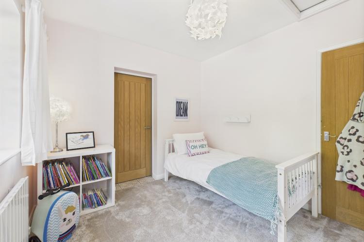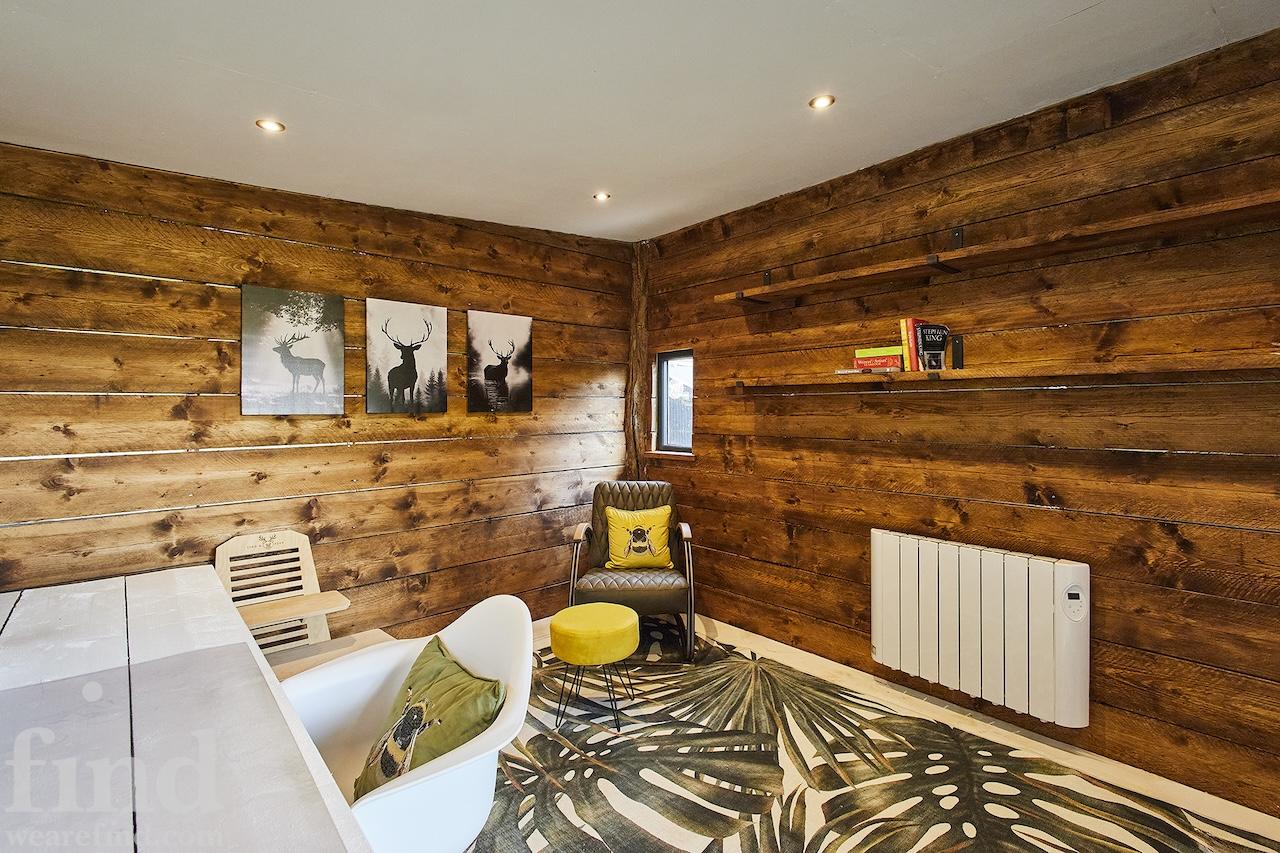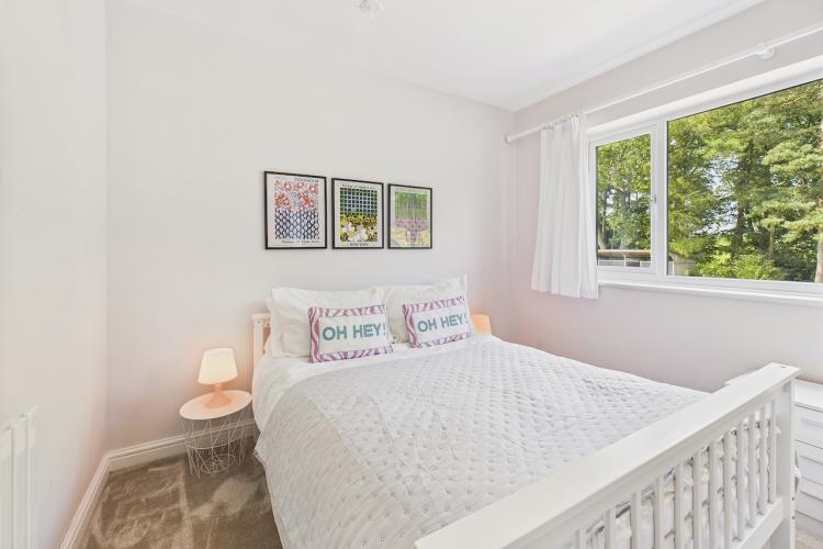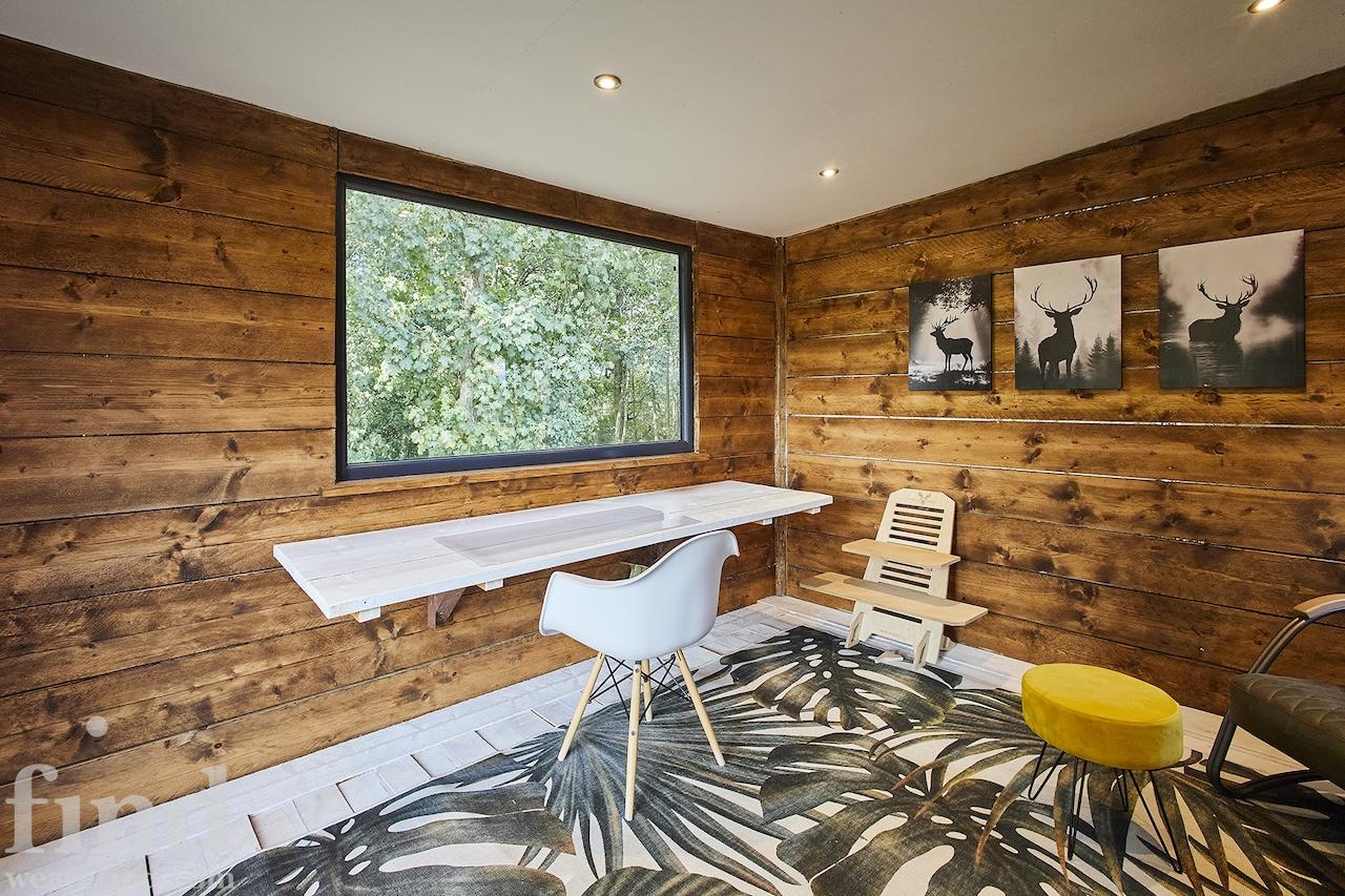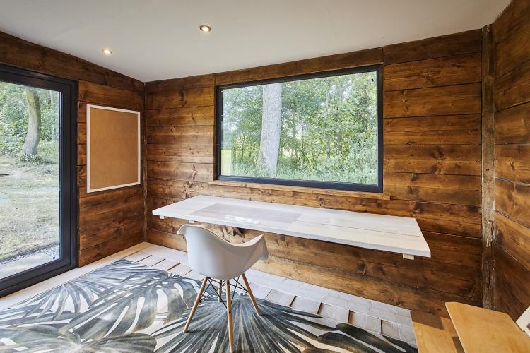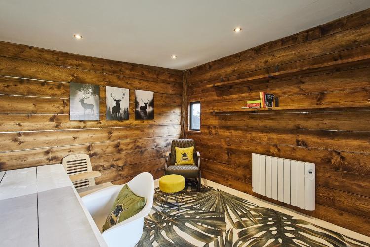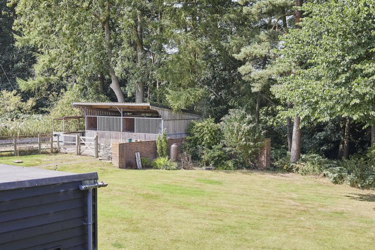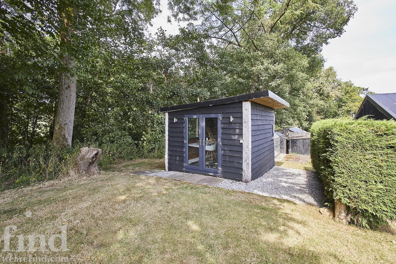 A well-equipped open plan kitchen and dining area. The bi-fold doors in the kitchen lead outside to the enclosed wrap-around garden. That offers a patio, lawn, and climbing frame and forest views. The dining room features a woodburning stove.