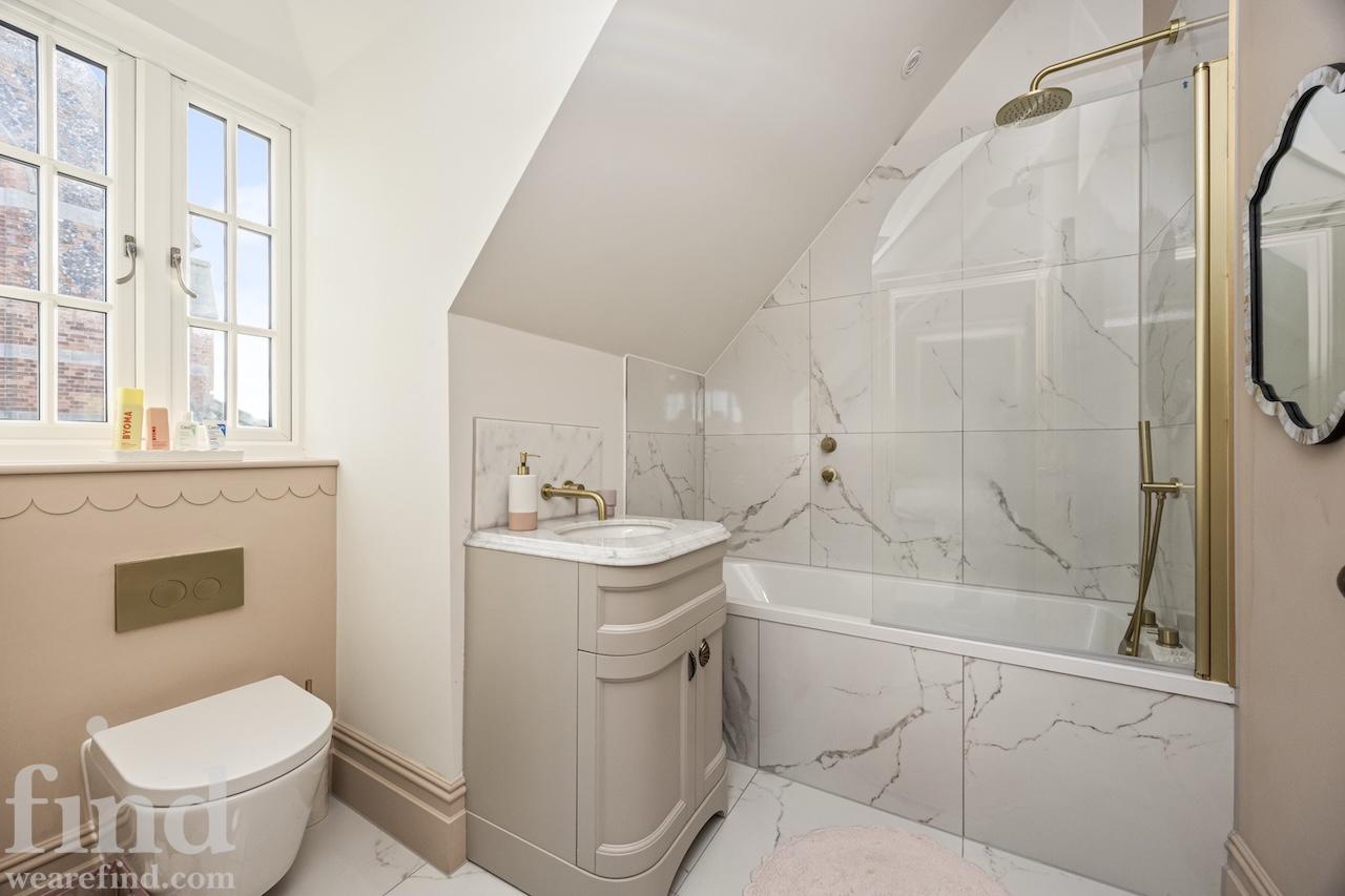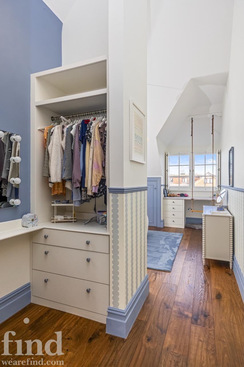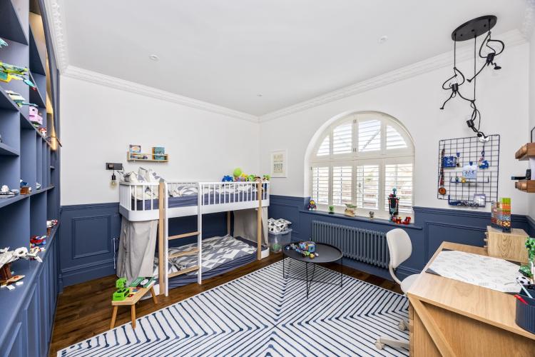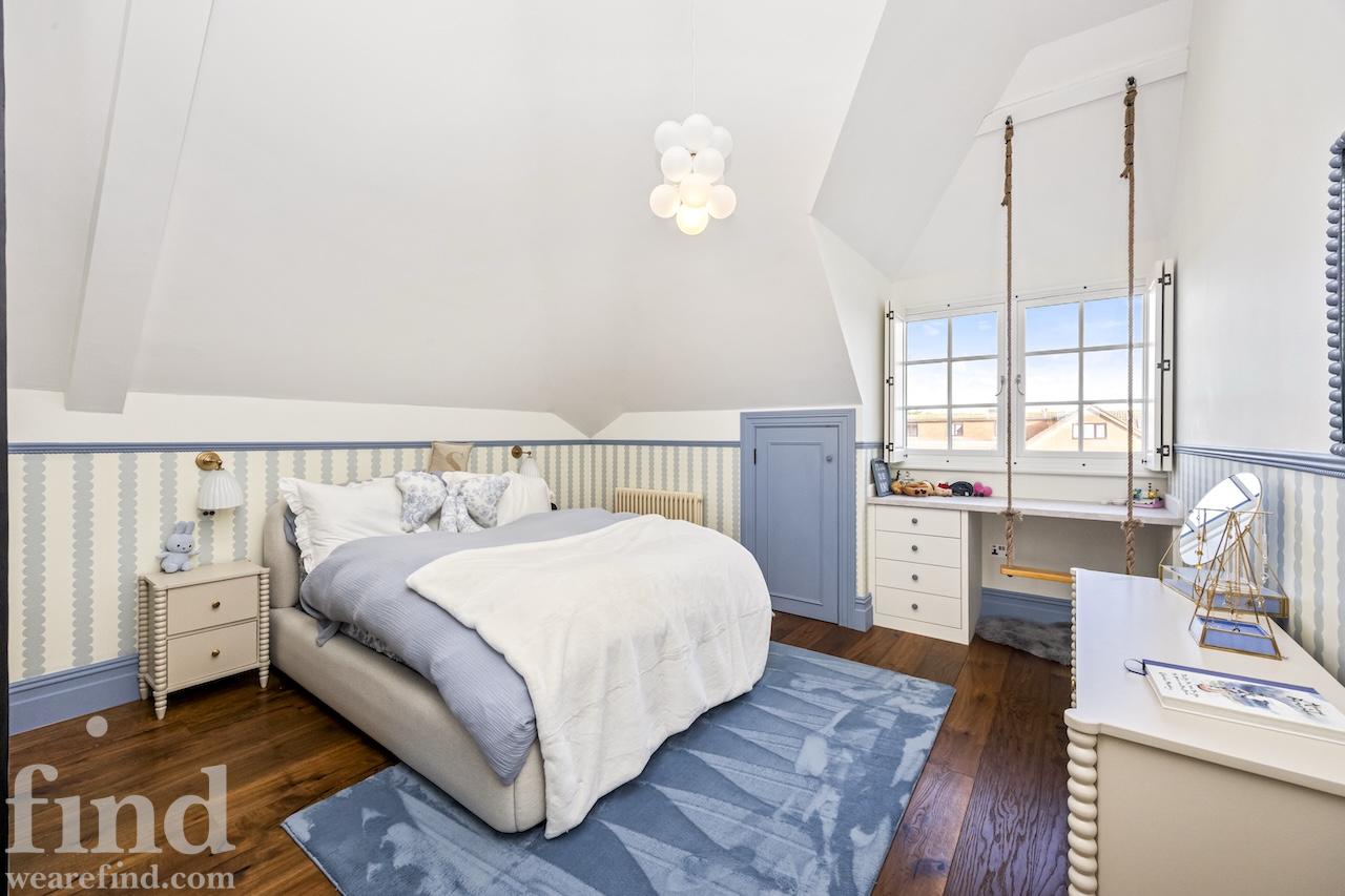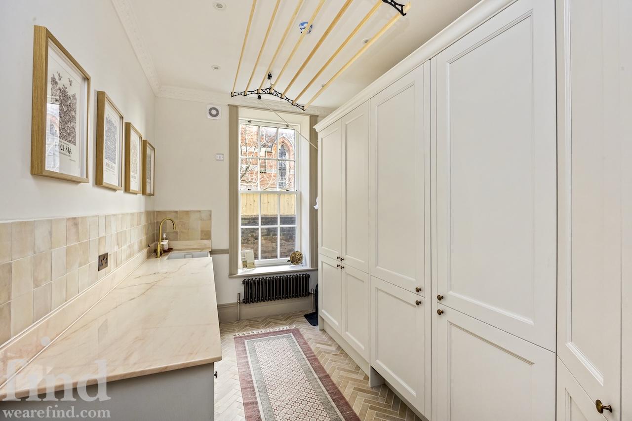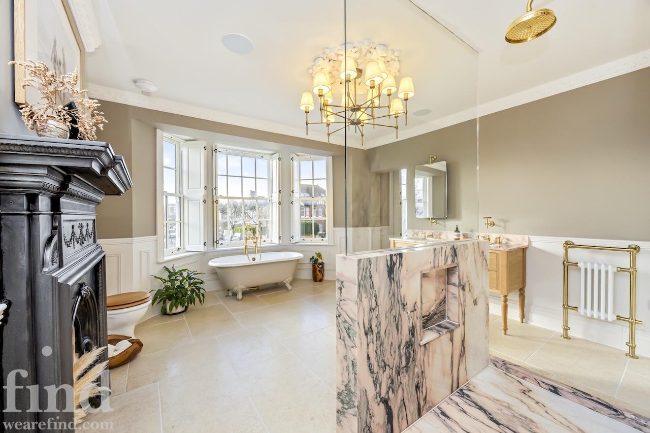 The ground floor also includes two individually styled reception rooms furnished with a mix of antiques and custom-made pieces, along with a utility room, boot room, powder room and bar area. Upstairs, the first floor hosts an impressive master suite with adjoining his-and-hers dressing rooms and a statement bathroom finished in dramatic Portugal Rosa marble, complete with an antique cast-iron fireplace dating from 1900. This level also includes a further bedroom suite with dressing room and marble bathroom, a dark and moody office, and an inviting guest room. The third floor features two double bedrooms, each with their own dressing room and bathroom, alongside a large open-plan teenage playroom with curved sofa seating and a playful pink kitchen.