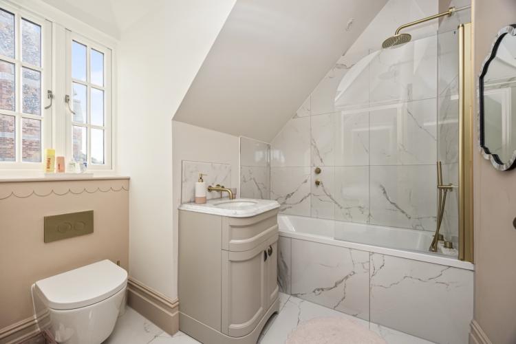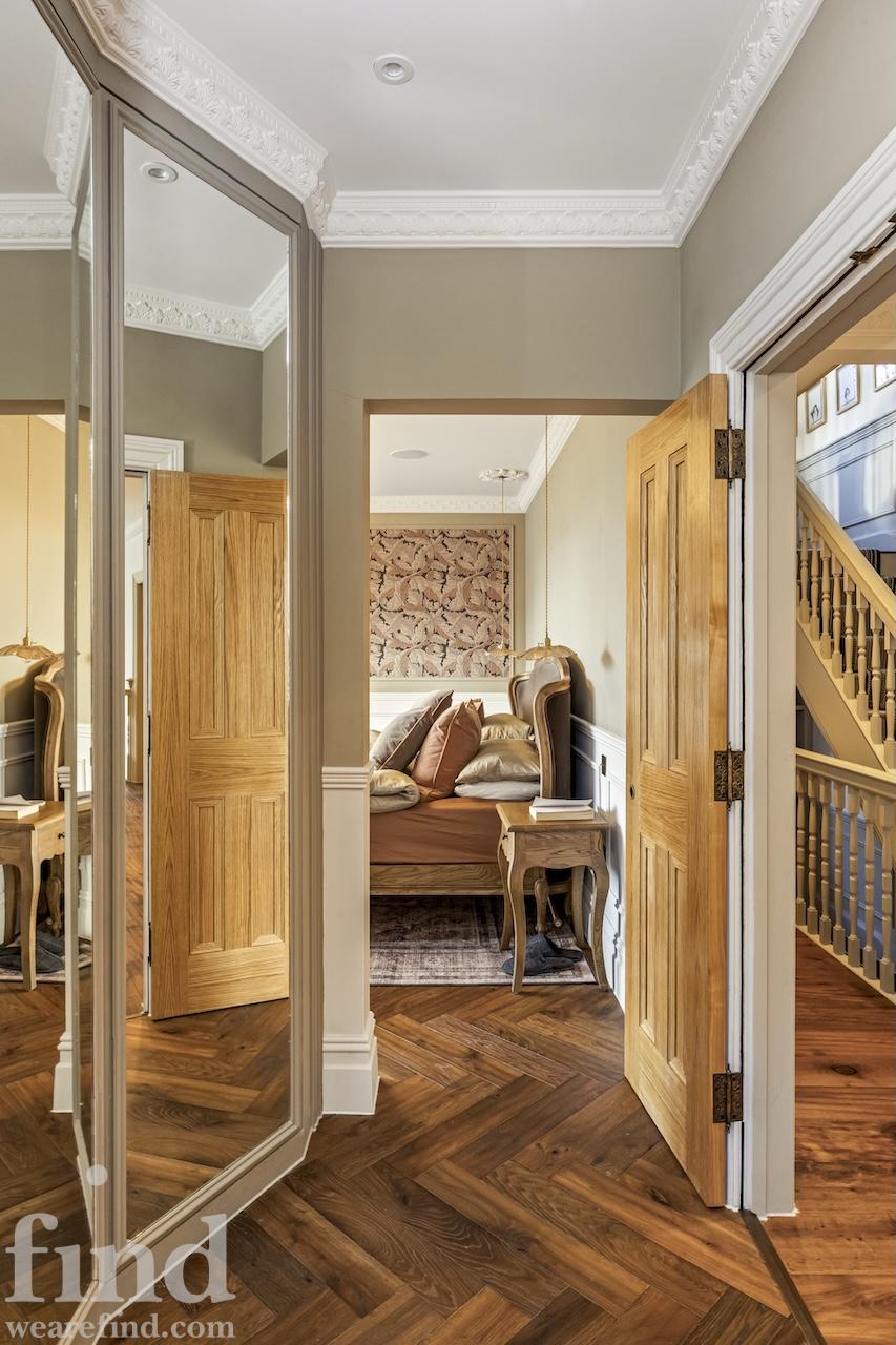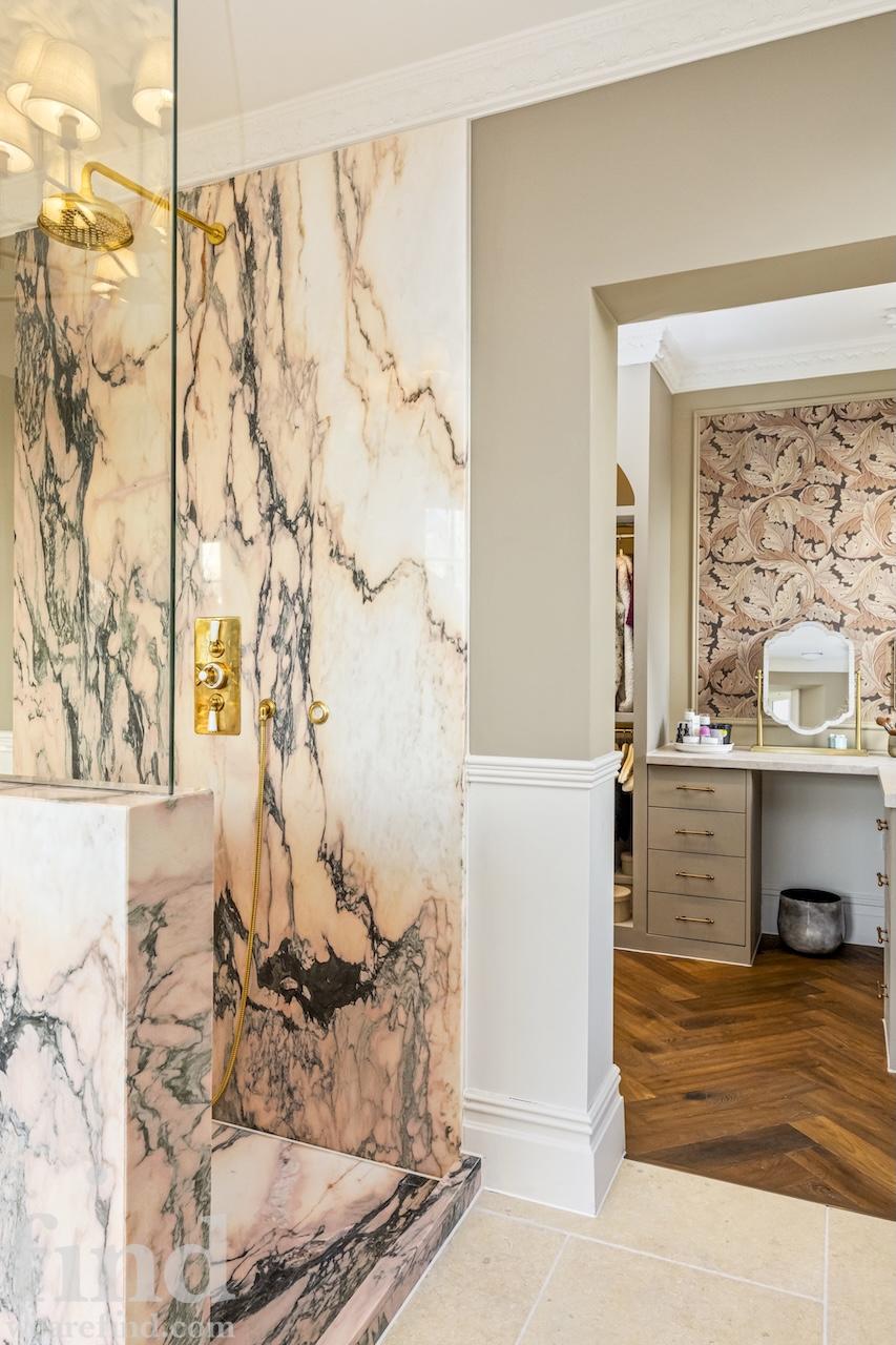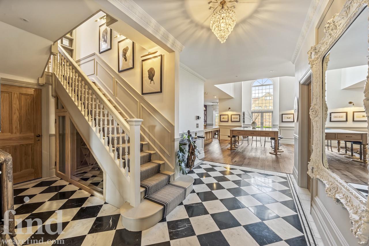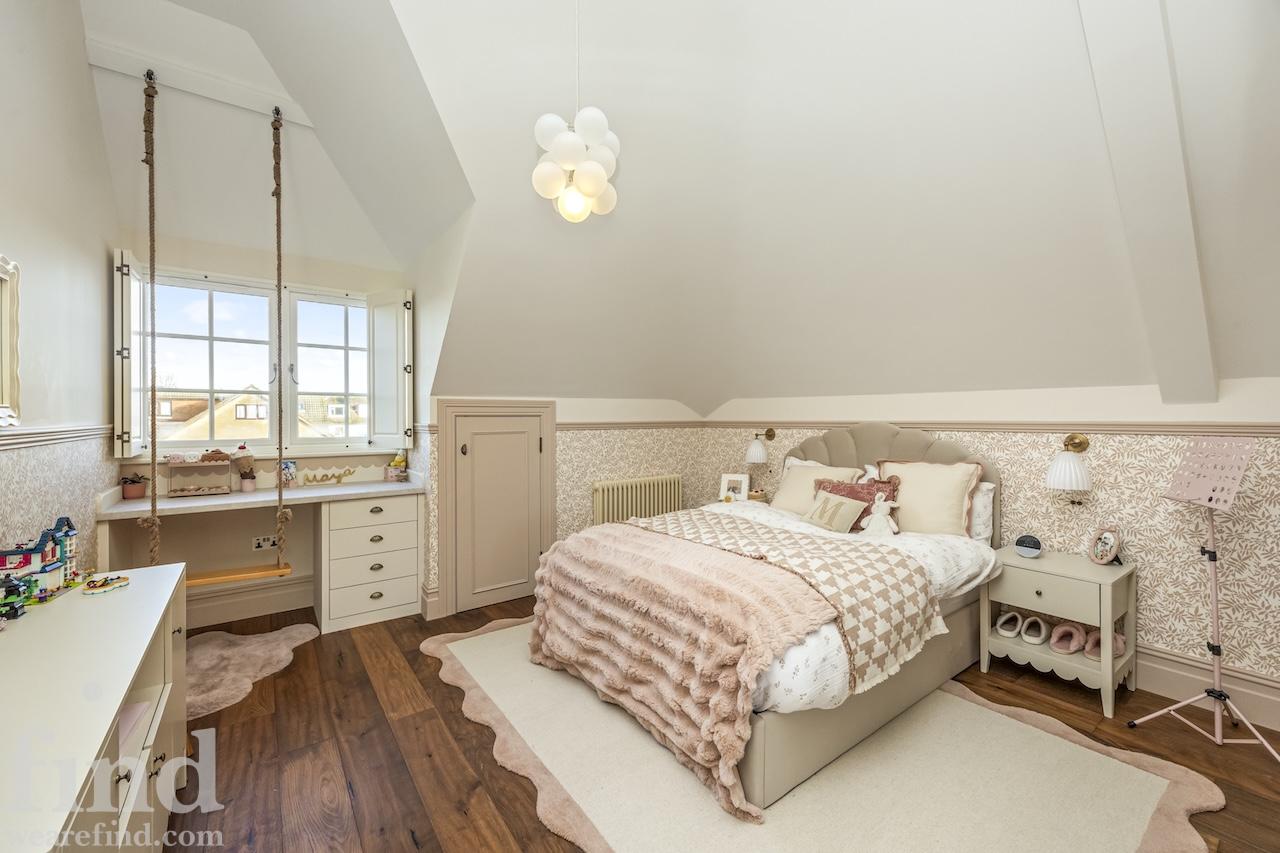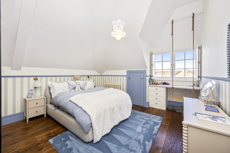 The ground floor also includes two individually styled reception rooms furnished with a mix of antiques and custom-made pieces, along with a utility room, boot room, powder room and bar area. Upstairs, the first floor hosts an impressive master suite with adjoining his-and-hers dressing rooms and a statement bathroom finished in dramatic Portugal Rosa marble, complete with an antique cast-iron fireplace dating from 1900. This level also includes a further bedroom suite with dressing room and marble bathroom, a dark and moody office, and an inviting guest room. The third floor features two double bedrooms, each with their own dressing room and bathroom, alongside a large open-plan teenage playroom with curved sofa seating and a playful pink kitchen.