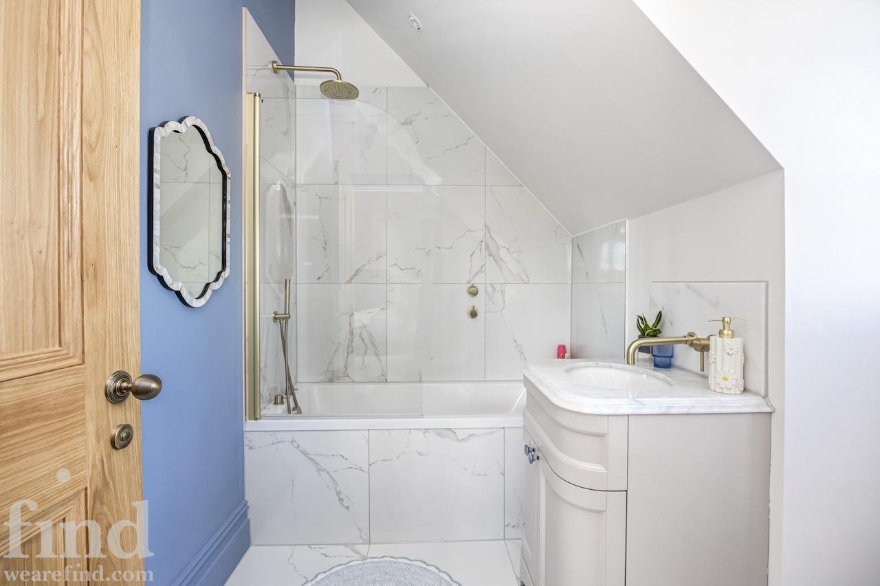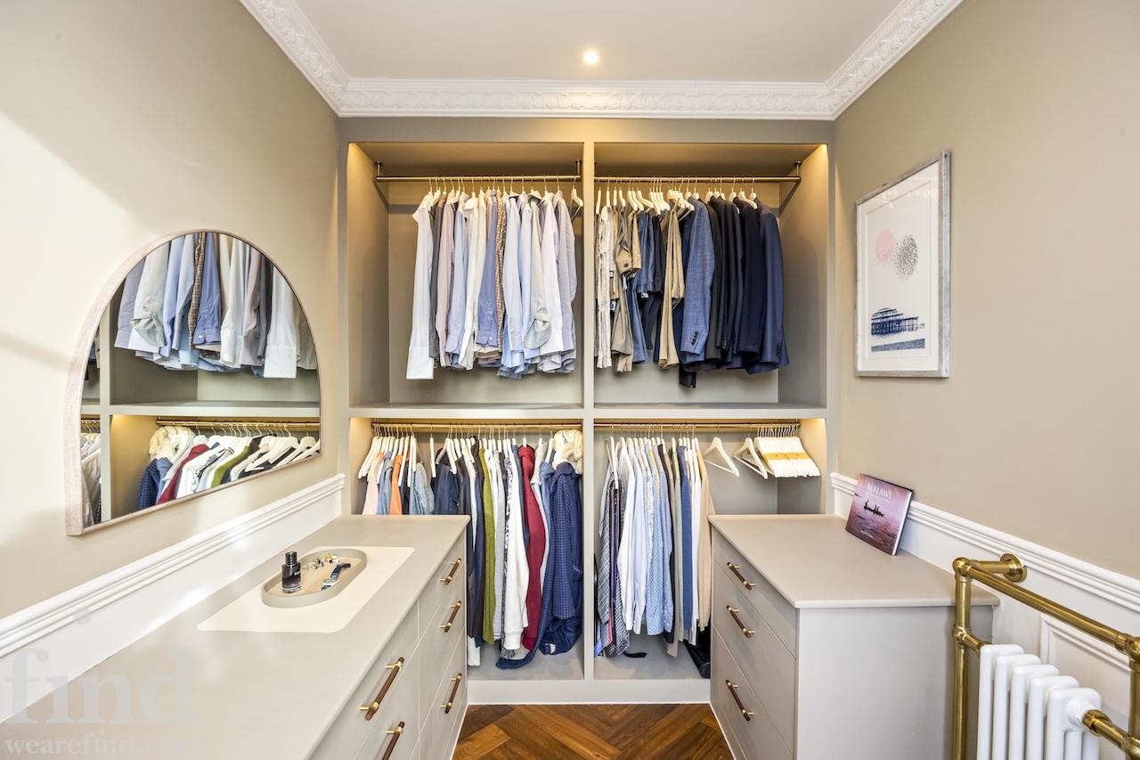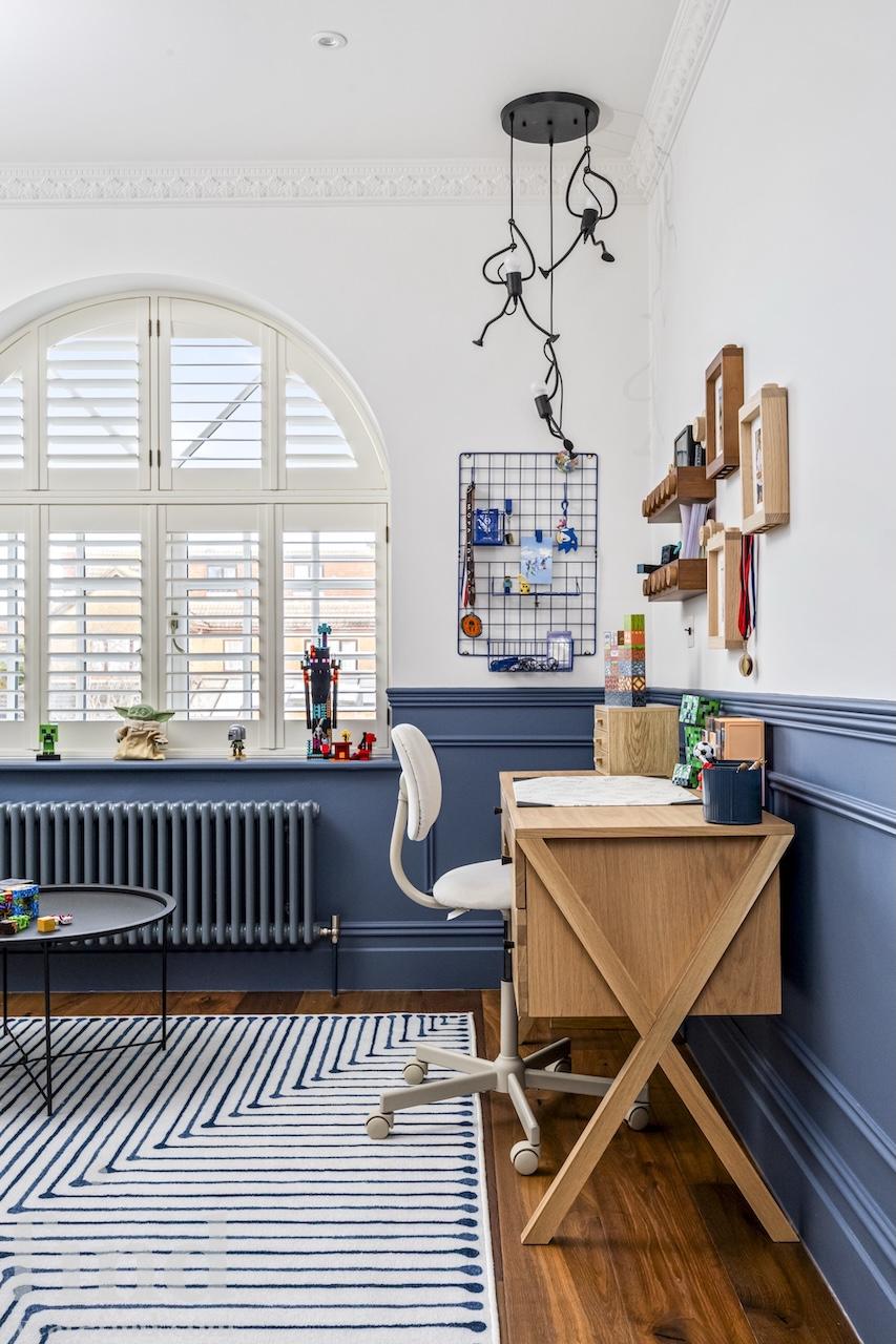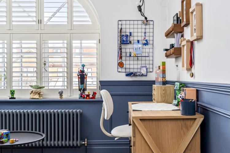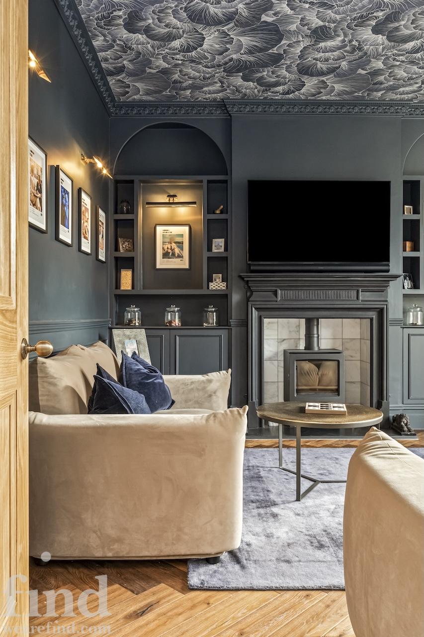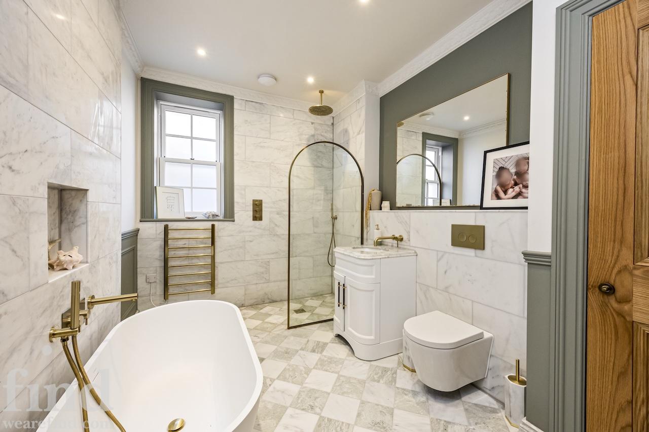 The ground floor also includes two individually styled reception rooms furnished with a mix of antiques and custom-made pieces, along with a utility room, boot room, powder room and bar area. Upstairs, the first floor hosts an impressive master suite with adjoining his-and-hers dressing rooms and a statement bathroom finished in dramatic Portugal Rosa marble, complete with an antique cast-iron fireplace dating from 1900. This level also includes a further bedroom suite with dressing room and marble bathroom, a dark and moody office, and an inviting guest room. The third floor features two double bedrooms, each with their own dressing room and bathroom, alongside a large open-plan teenage playroom with curved sofa seating and a playful pink kitchen.