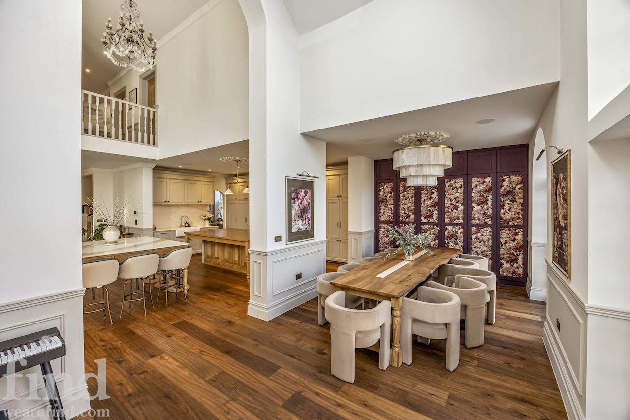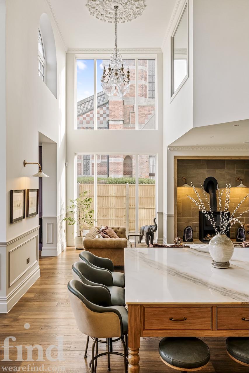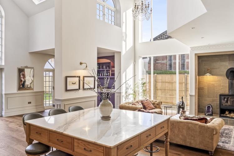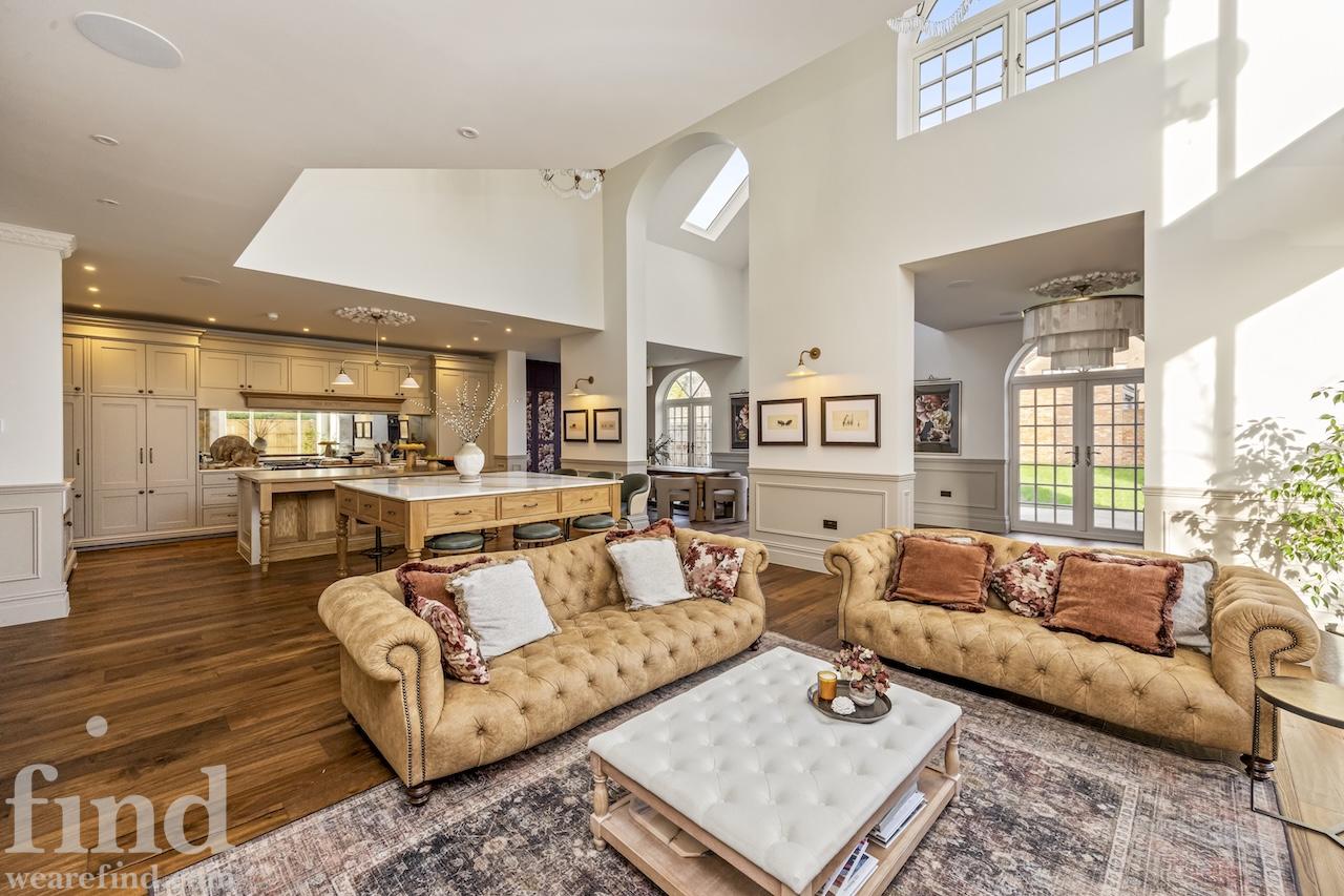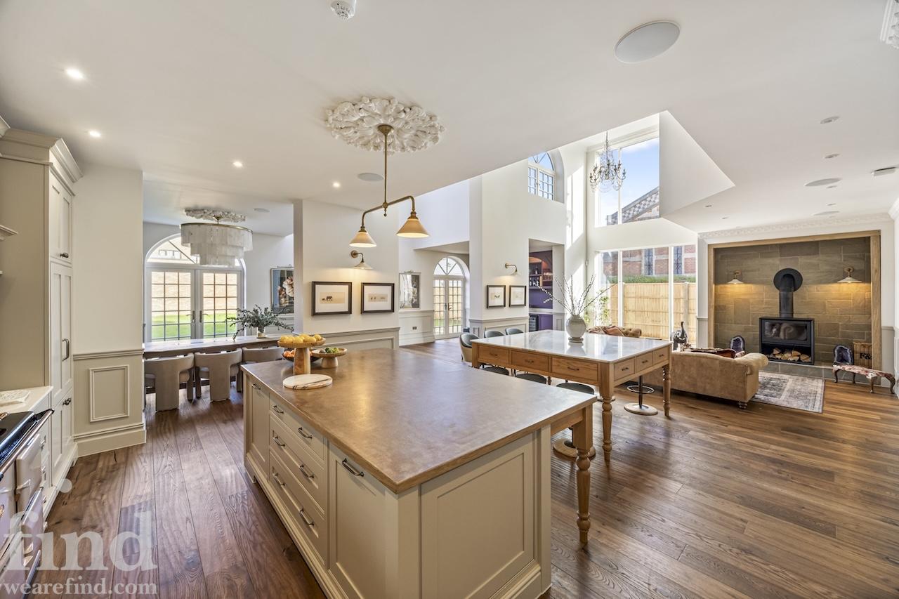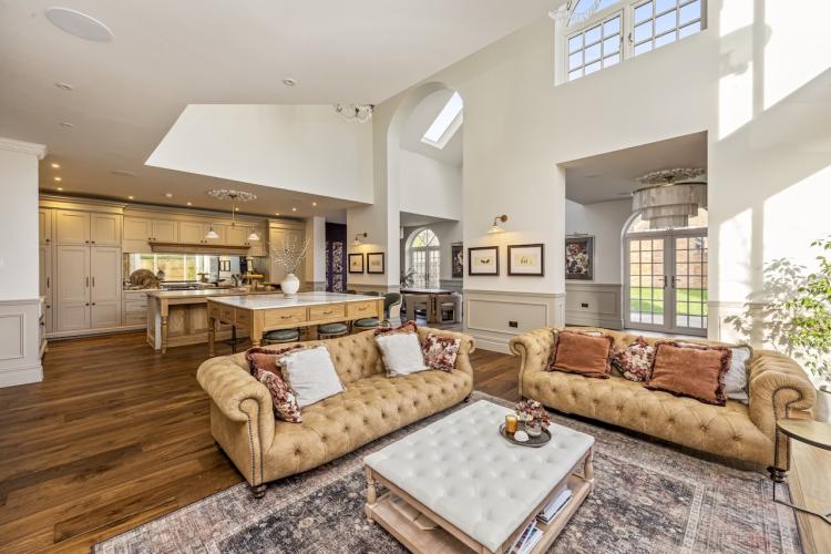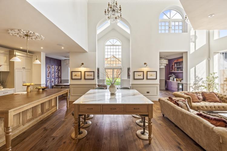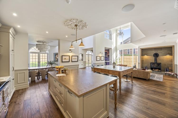 At the heart of the home is a spectacular open-plan kitchen and living space. Double-height ceilings, 19th-century chandeliers and vast windows flood the room with light, while a soft-pink four-oven AGA takes centre stage alongside a Neff oven, two dishwashers and multiple butler sinks. Two large islands complemented by a uniquely carved dining table and bespoke cabinetry throughout. A relaxed seating area features two generous sofas, with a huge log burner and the AGA.
