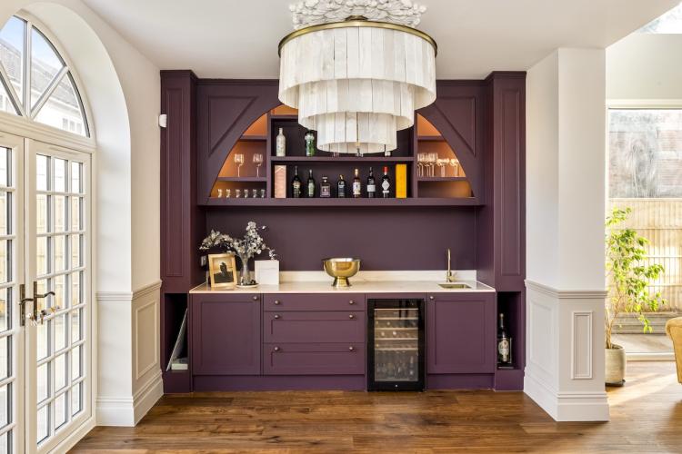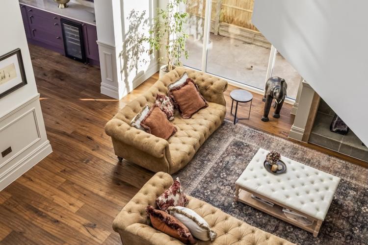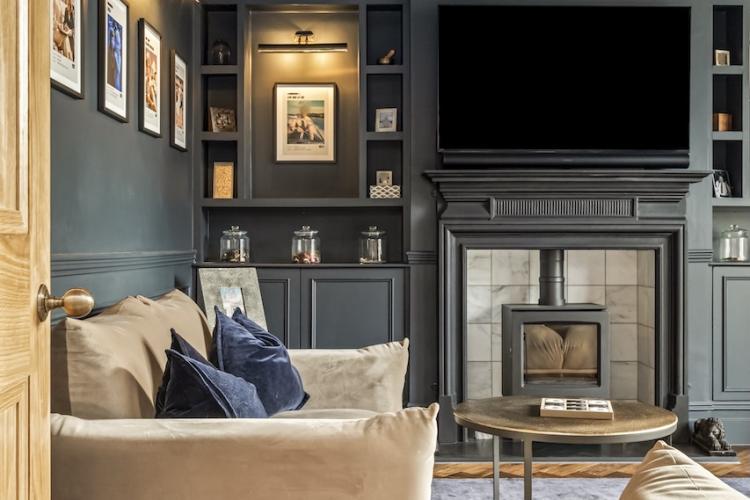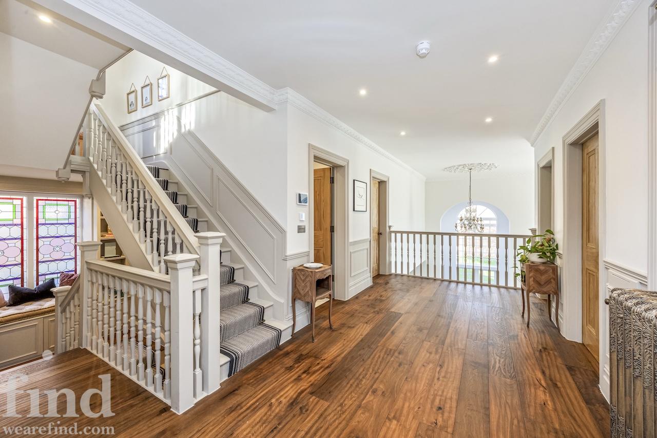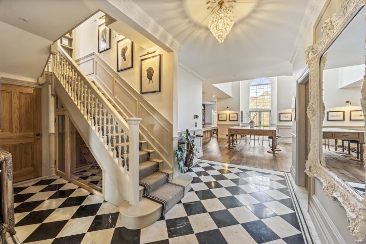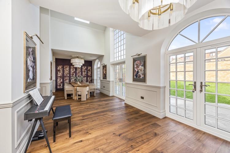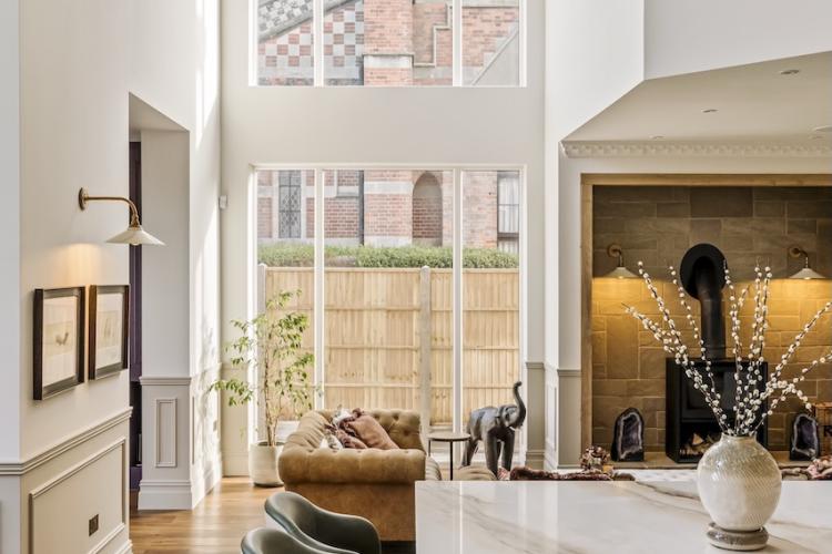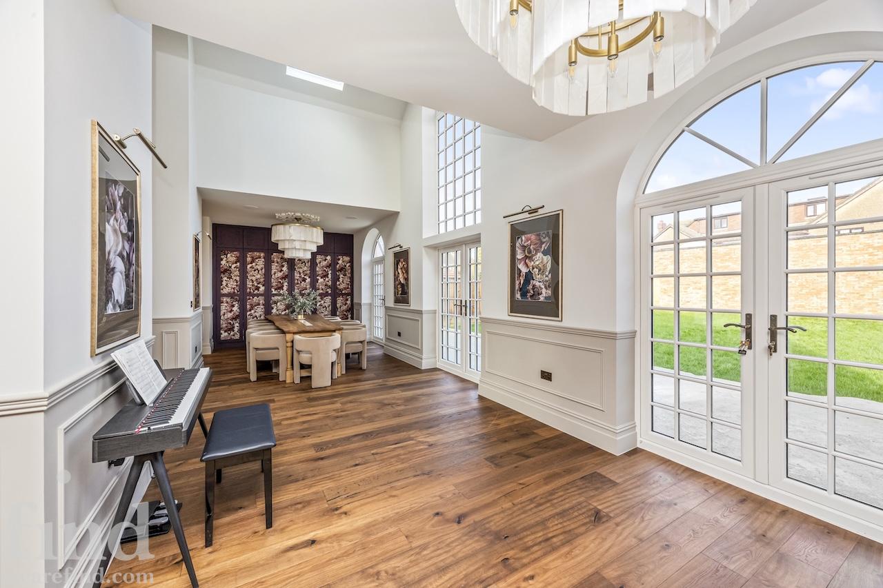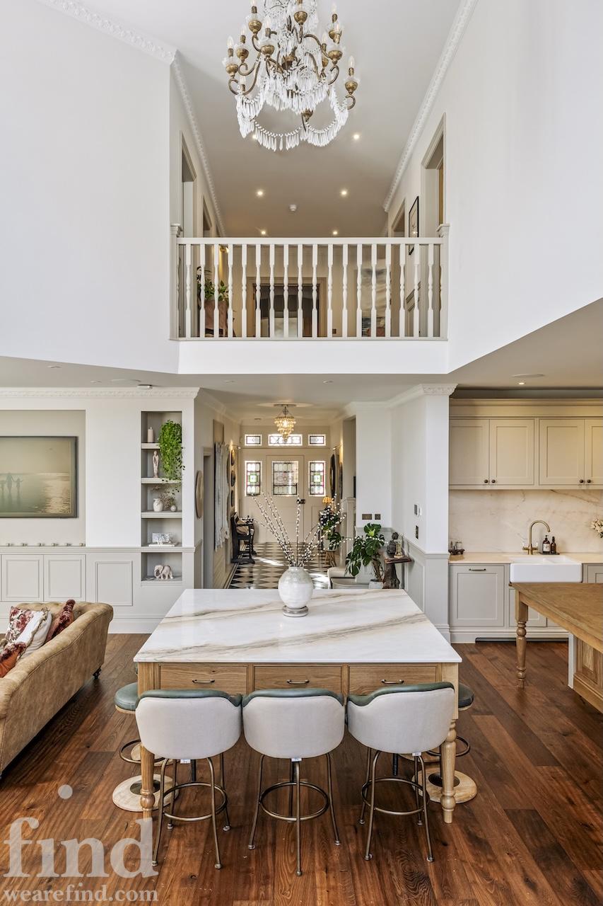 At the heart of the home is a spectacular open-plan kitchen and living space. Double-height ceilings, 19th-century chandeliers and vast windows flood the room with light, while a soft-pink four-oven AGA takes centre stage alongside a Neff oven, two dishwashers and multiple butler sinks. Two large islands complemented by a uniquely carved dining table and bespoke cabinetry throughout. A relaxed seating area features two generous sofas, with a huge log burner and the AGA.