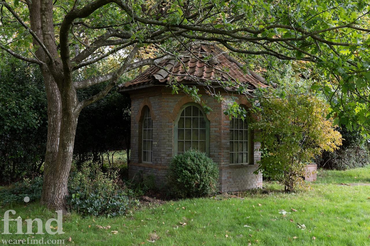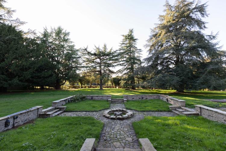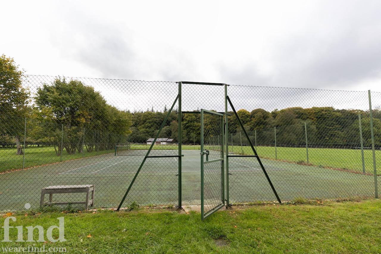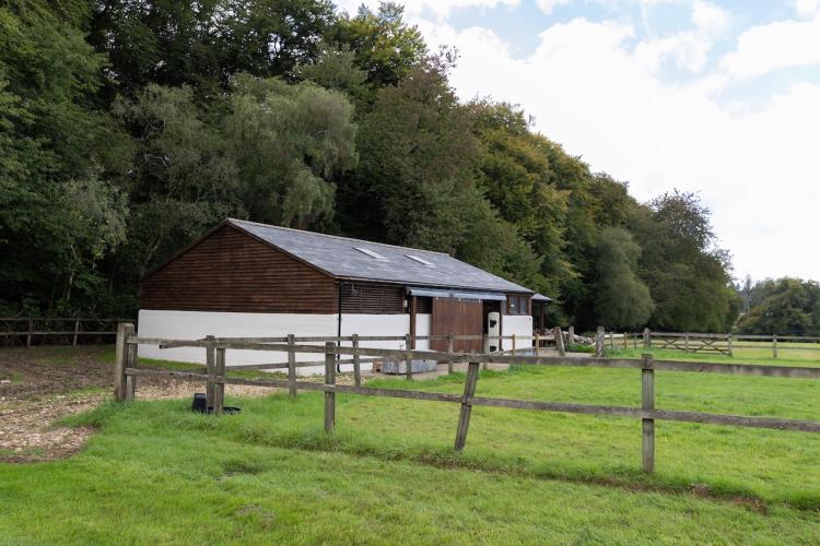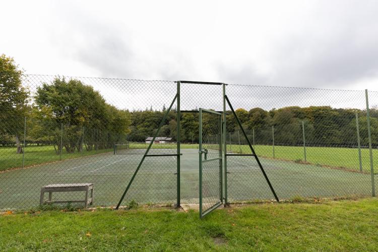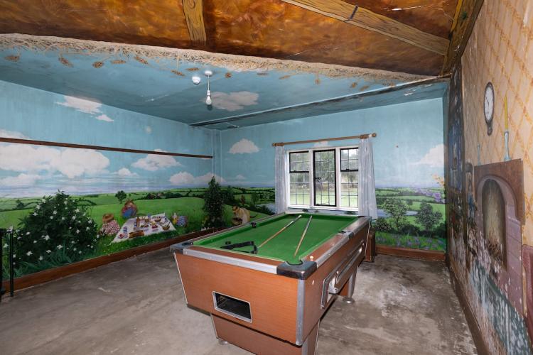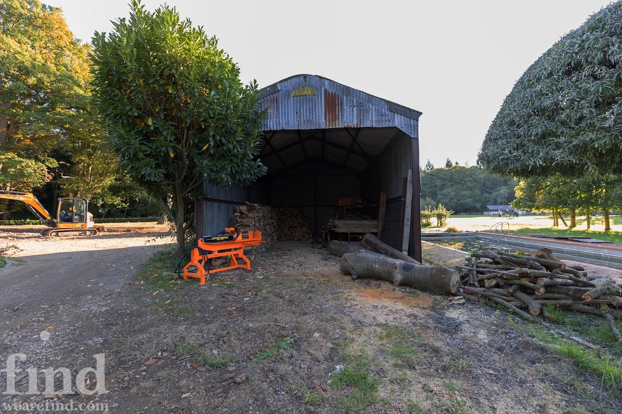 Set within 150 acres of private countryside, the estate features three additional houses, stables, fields, formal gardens, orchards, two swimming pools, a tennis court, an industrial metal hangar, and over 130 acres of ancient woodland.