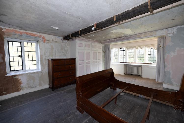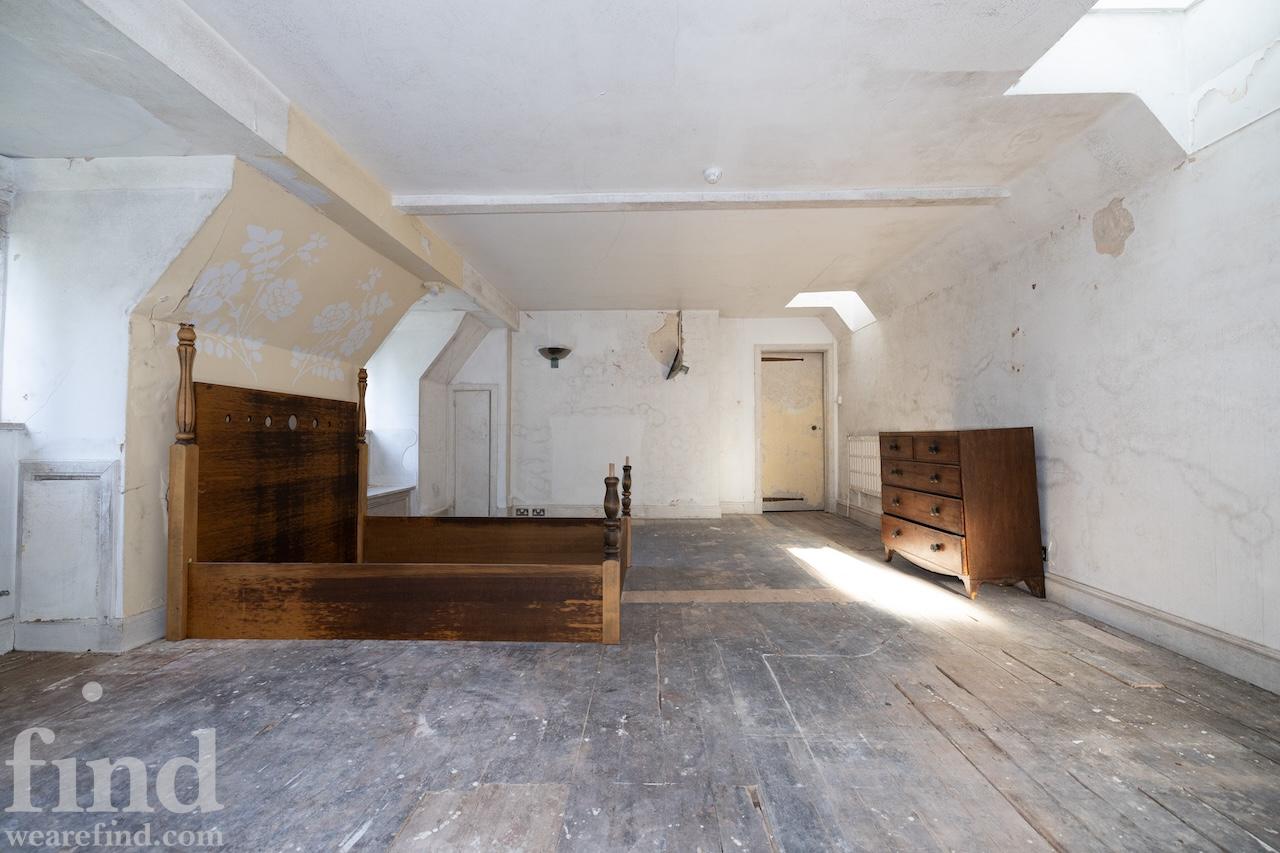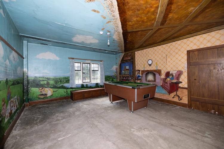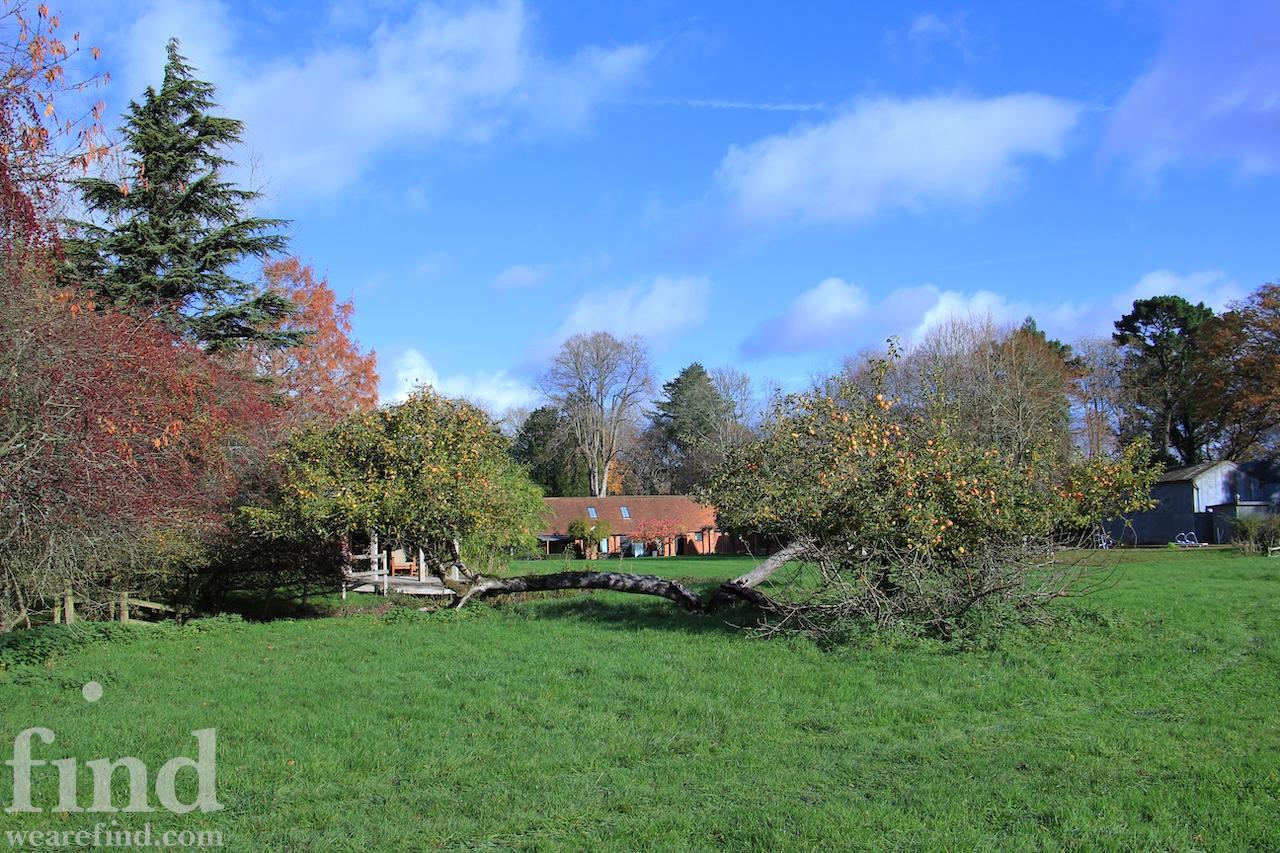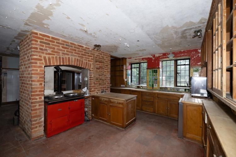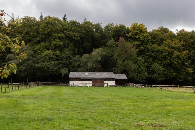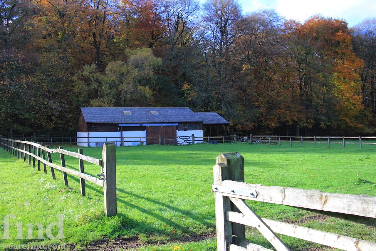Set within 150 acres of private countryside, the estate features three additional houses, stables, fields, formal gardens, orchards, two swimming pools, a tennis court, an industrial metal hangar, and over 130 acres of ancient woodland.
