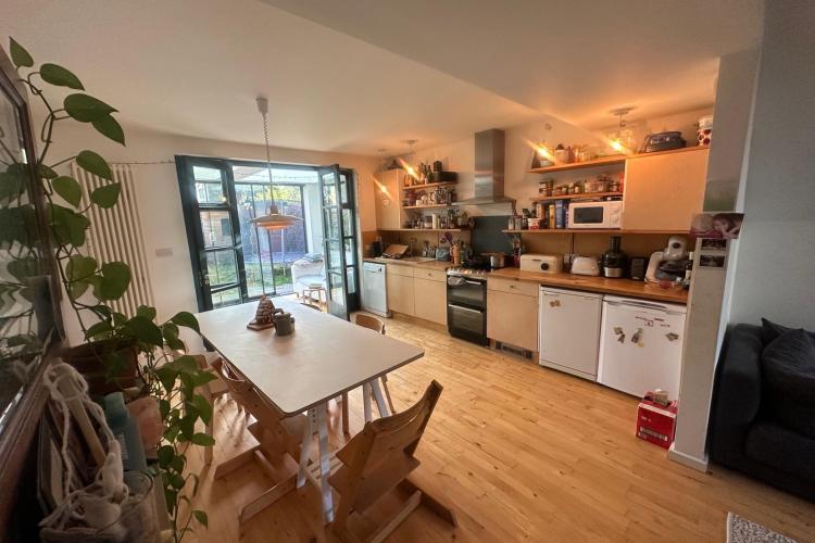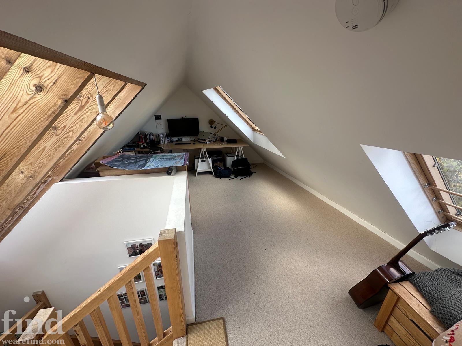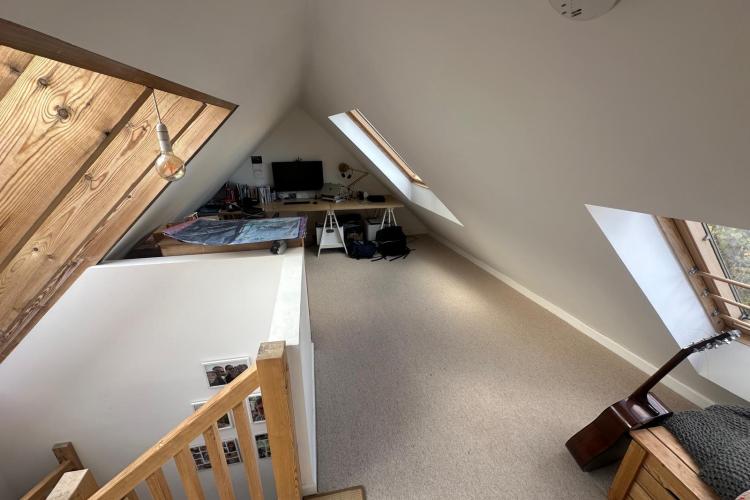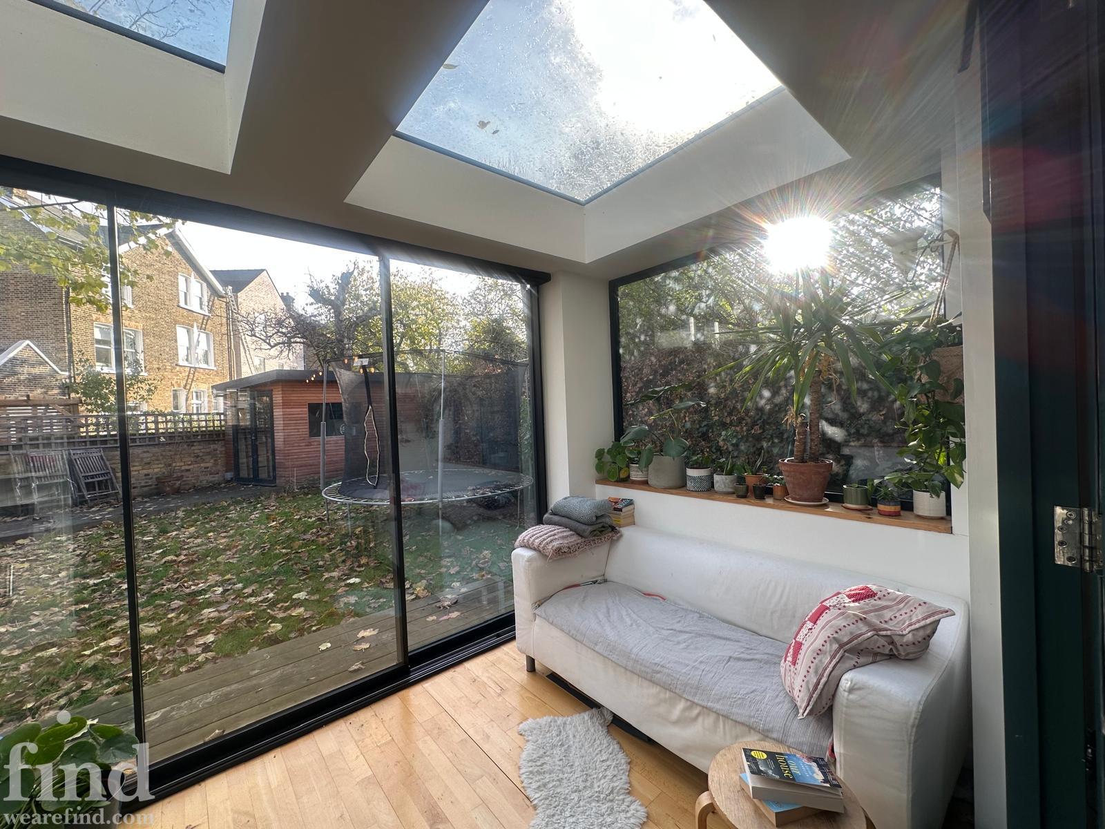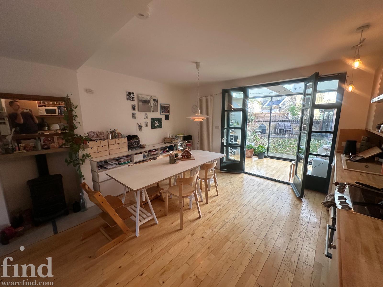 125 square meters, large open plan living area with hard wood floors. 3 bedrooms, loft conversion, modern conservatory, garden office. Light-filled space, with French windows and large skylights throughout. Open staircase to loft.