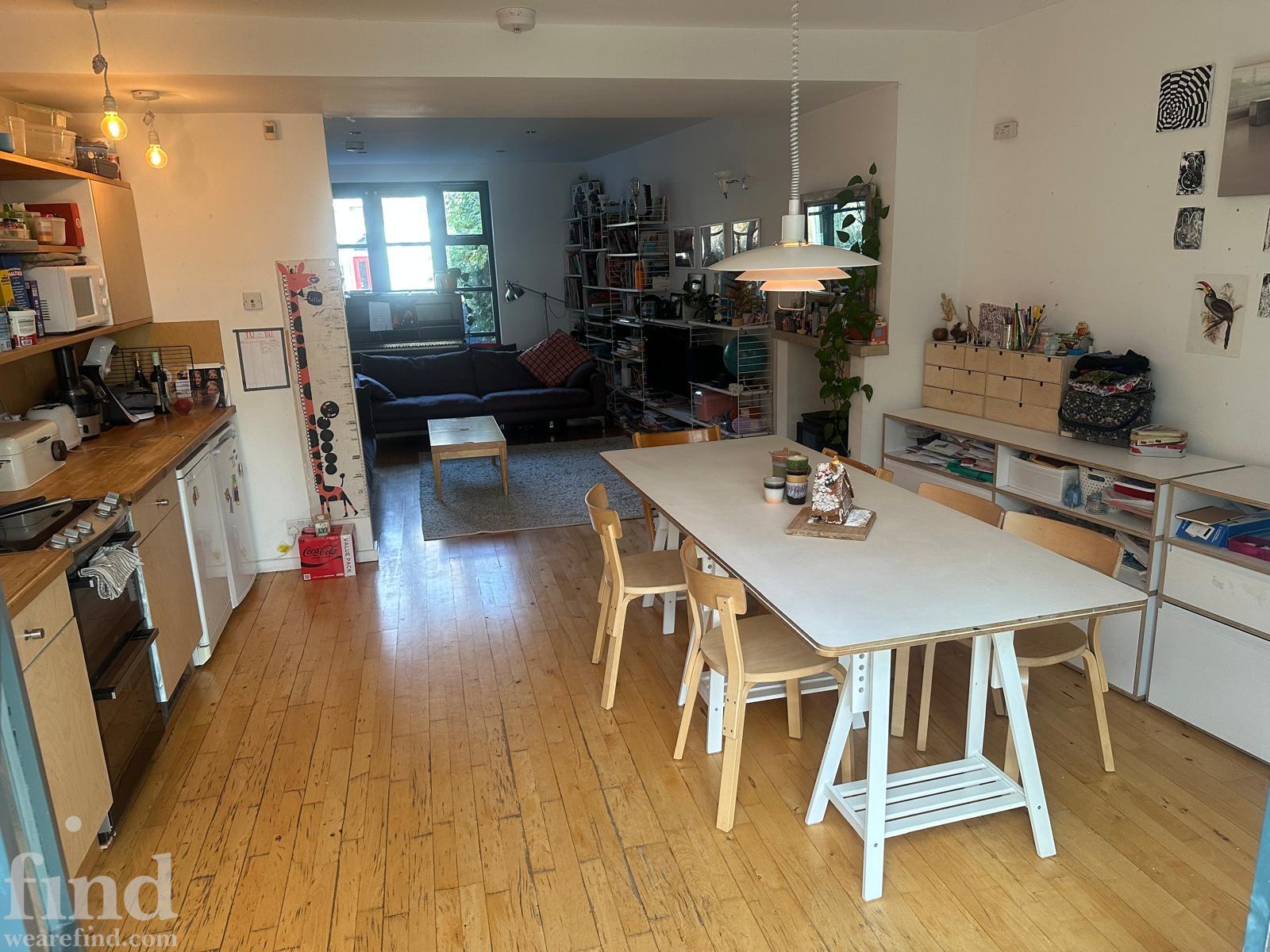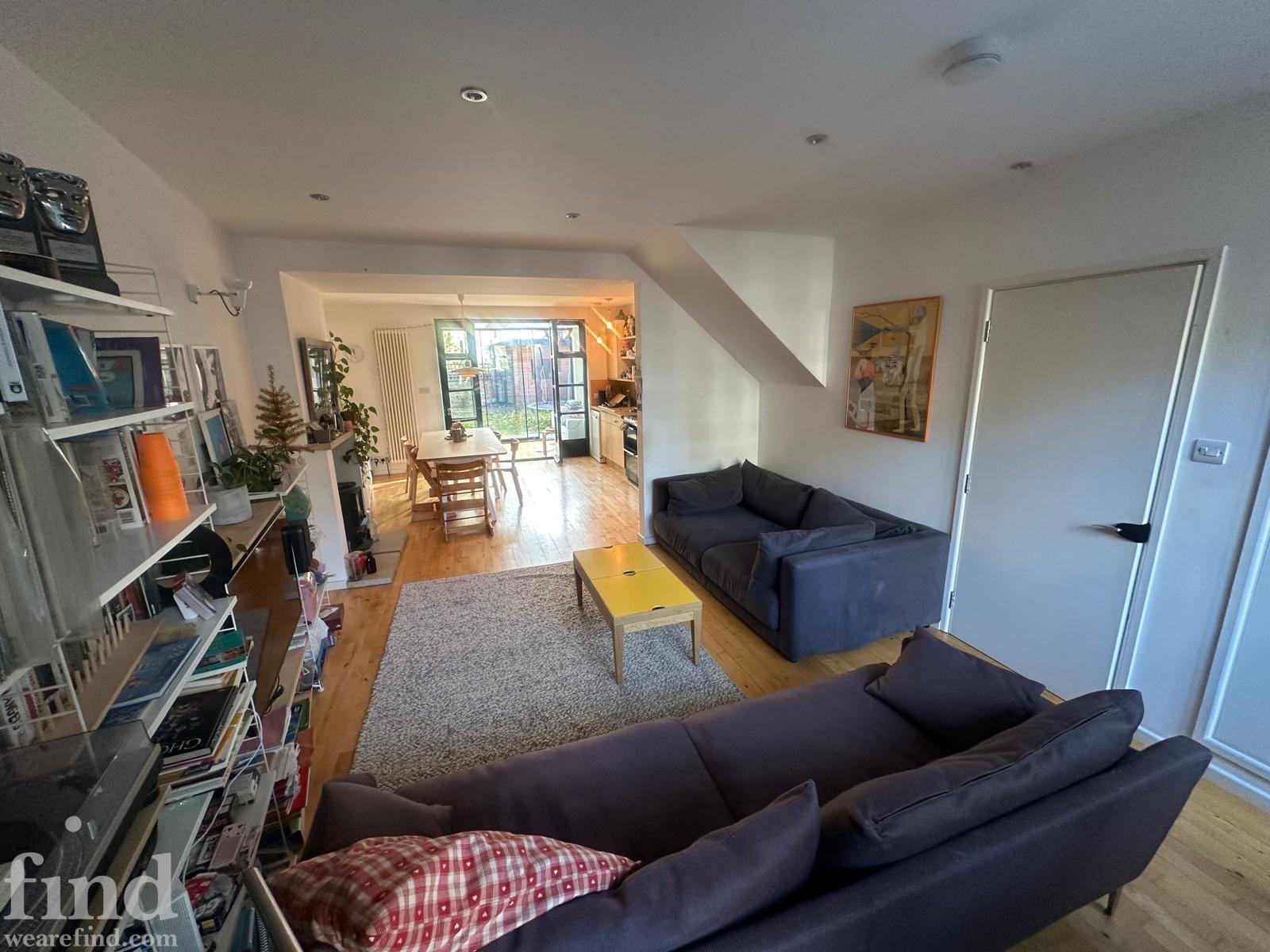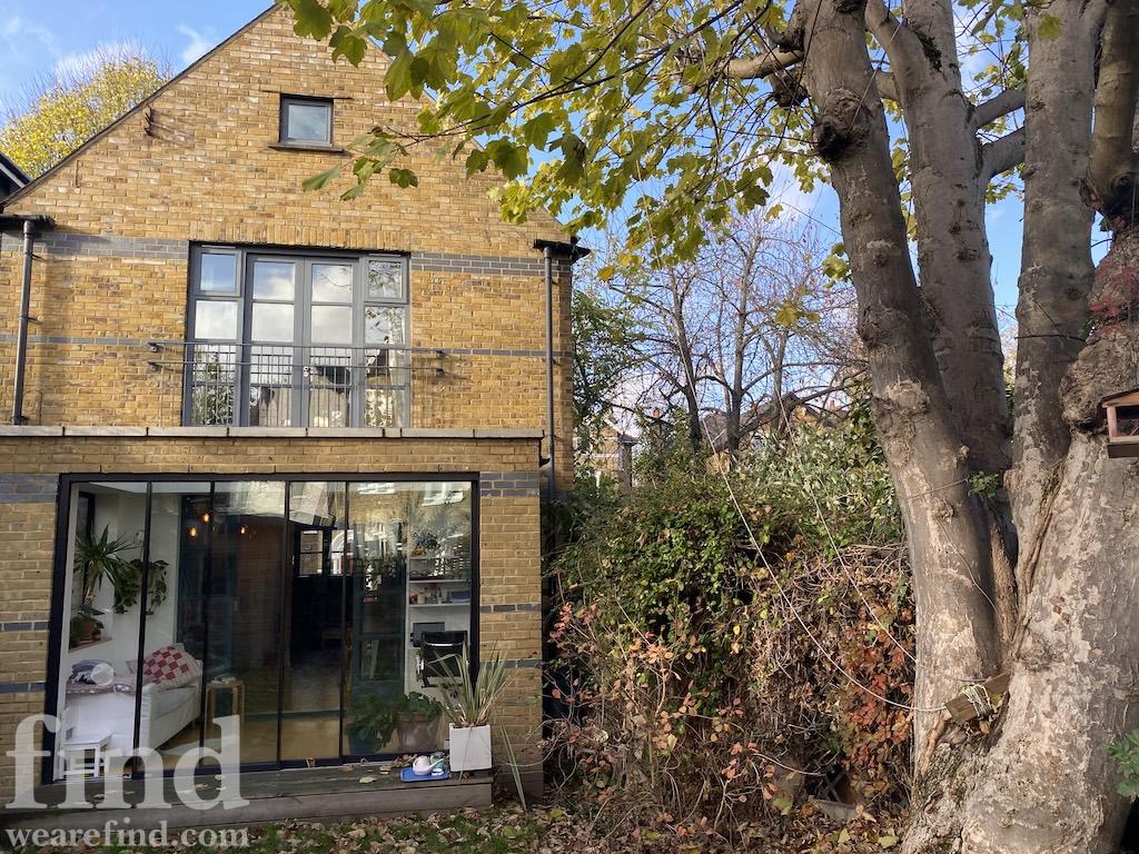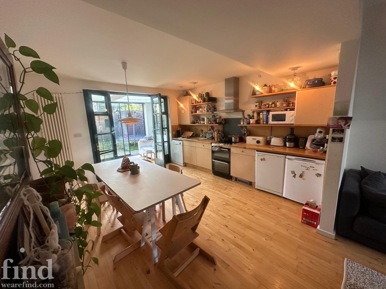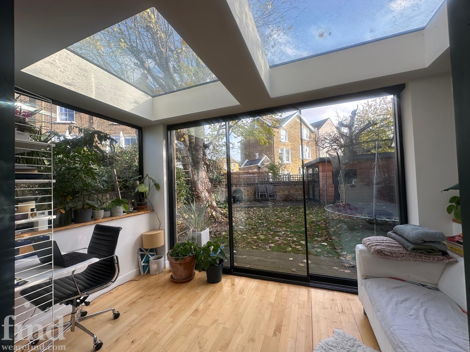 125 square meters, large open plan living area with hard wood floors. 3 bedrooms, loft conversion, modern conservatory, garden office. Light-filled space, with French windows and large skylights throughout. Open staircase to loft.
