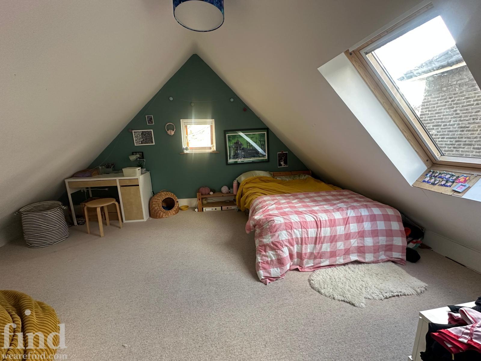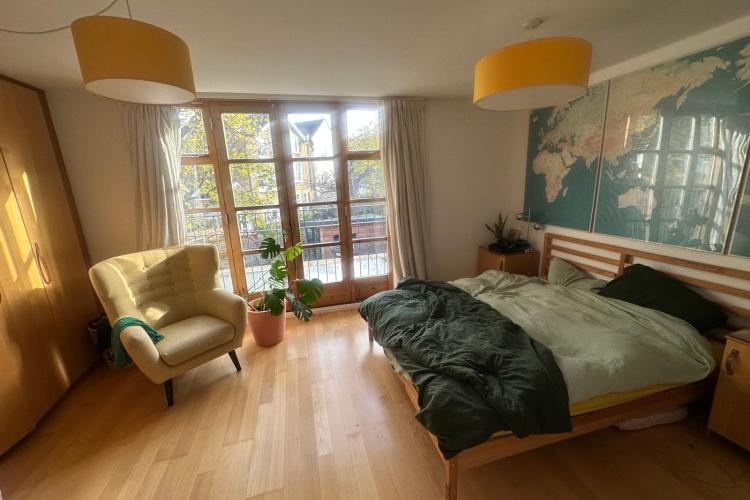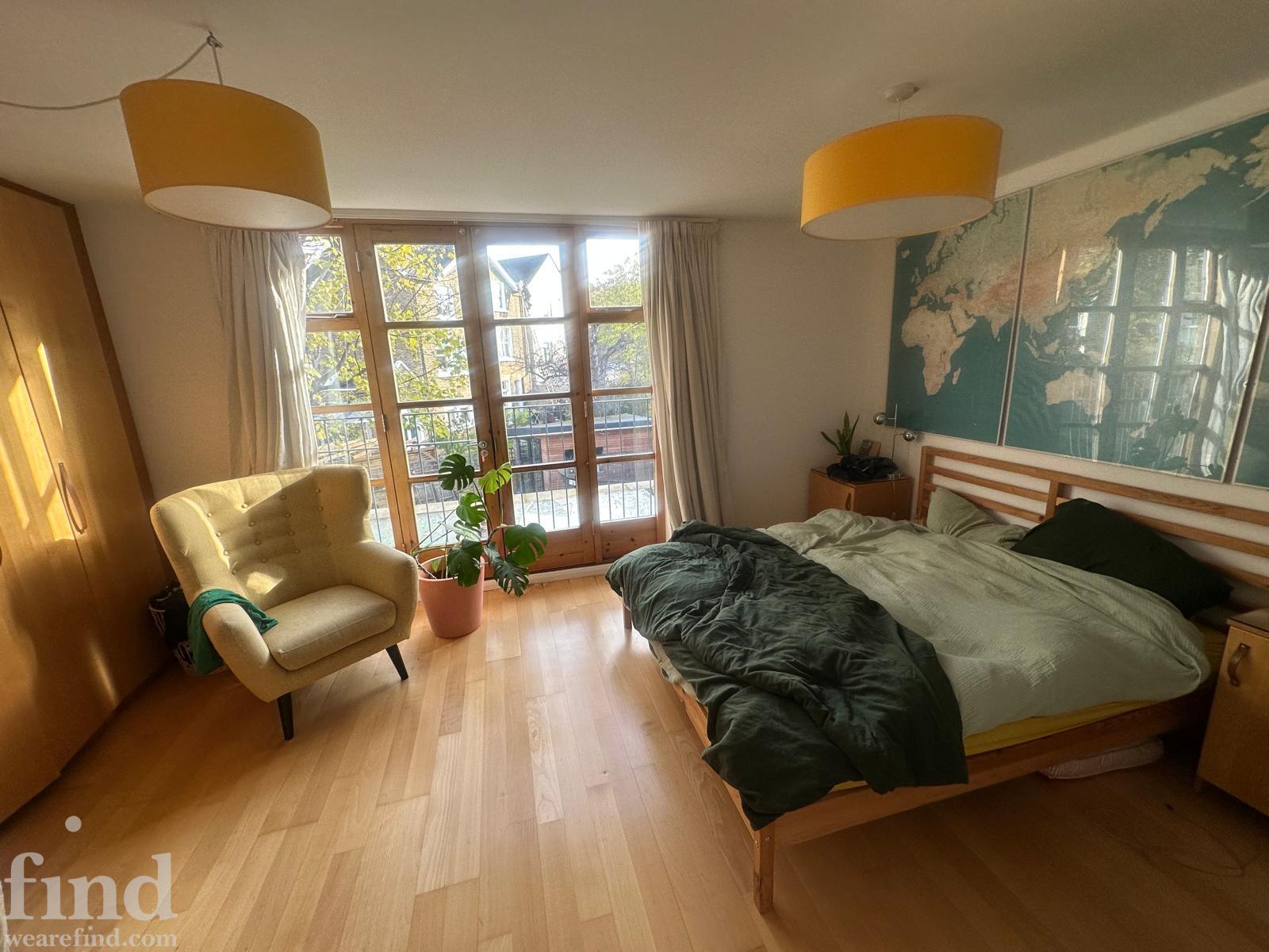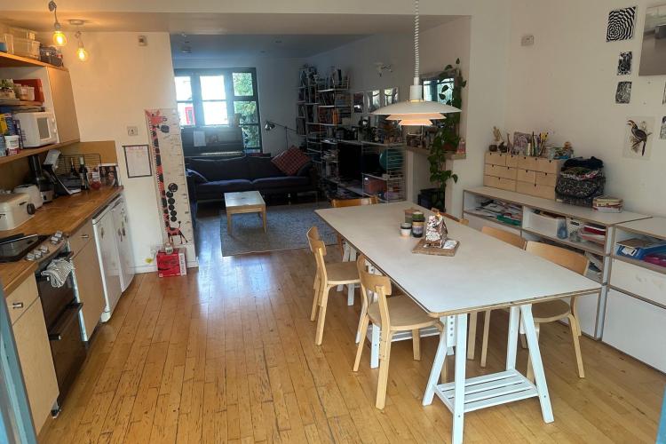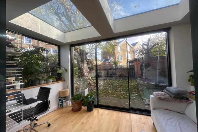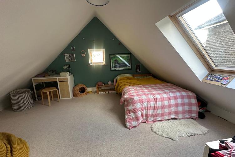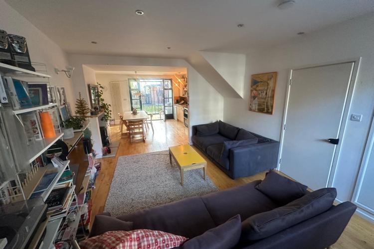 125 square meters, large open plan living area with hard wood floors. 3 bedrooms, loft conversion, modern conservatory, garden office. Light-filled space, with French windows and large skylights throughout. Open staircase to loft.