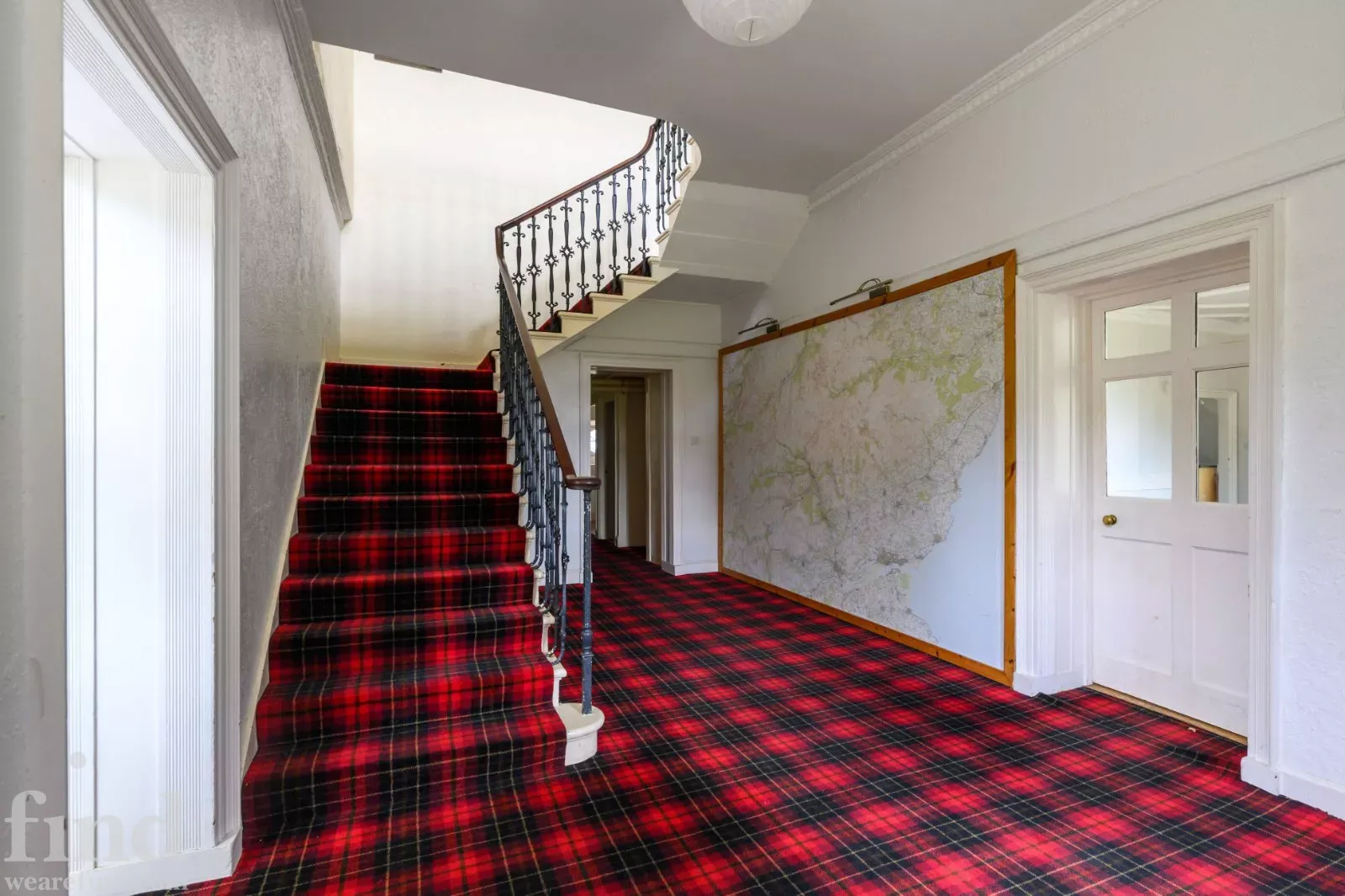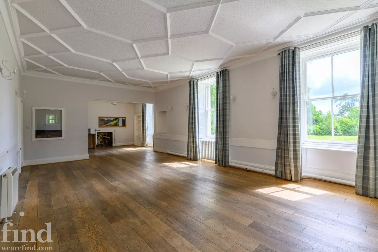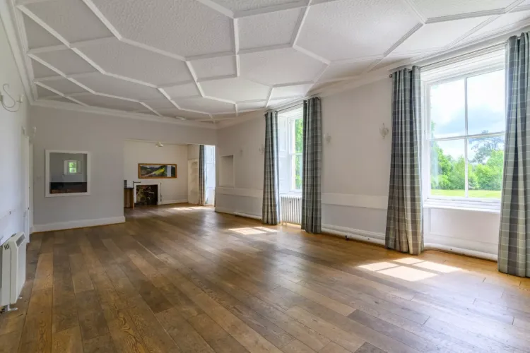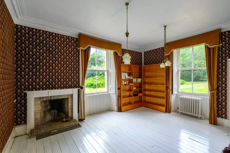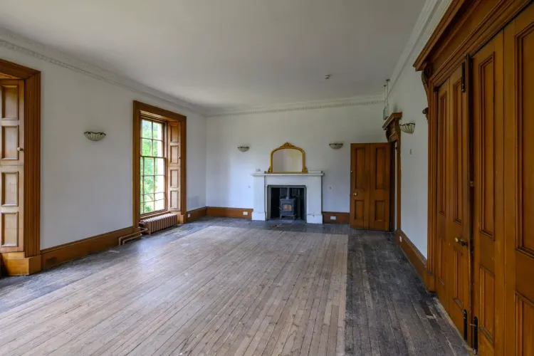 Situated amidst extensive wooded grounds with mature trees and bordered to the east by a tranquil river, the property combines heritage charm with rural character. On-site historic features include an old curling pond and a walled garden.