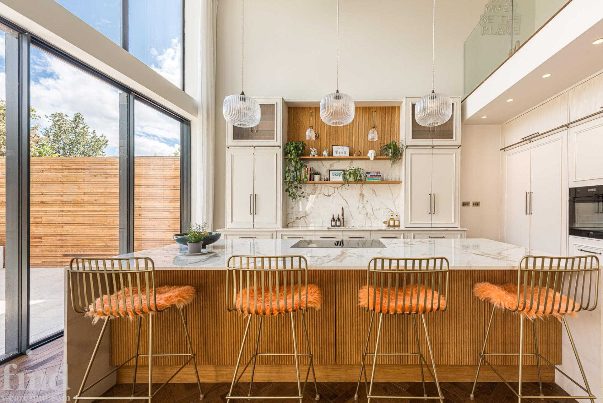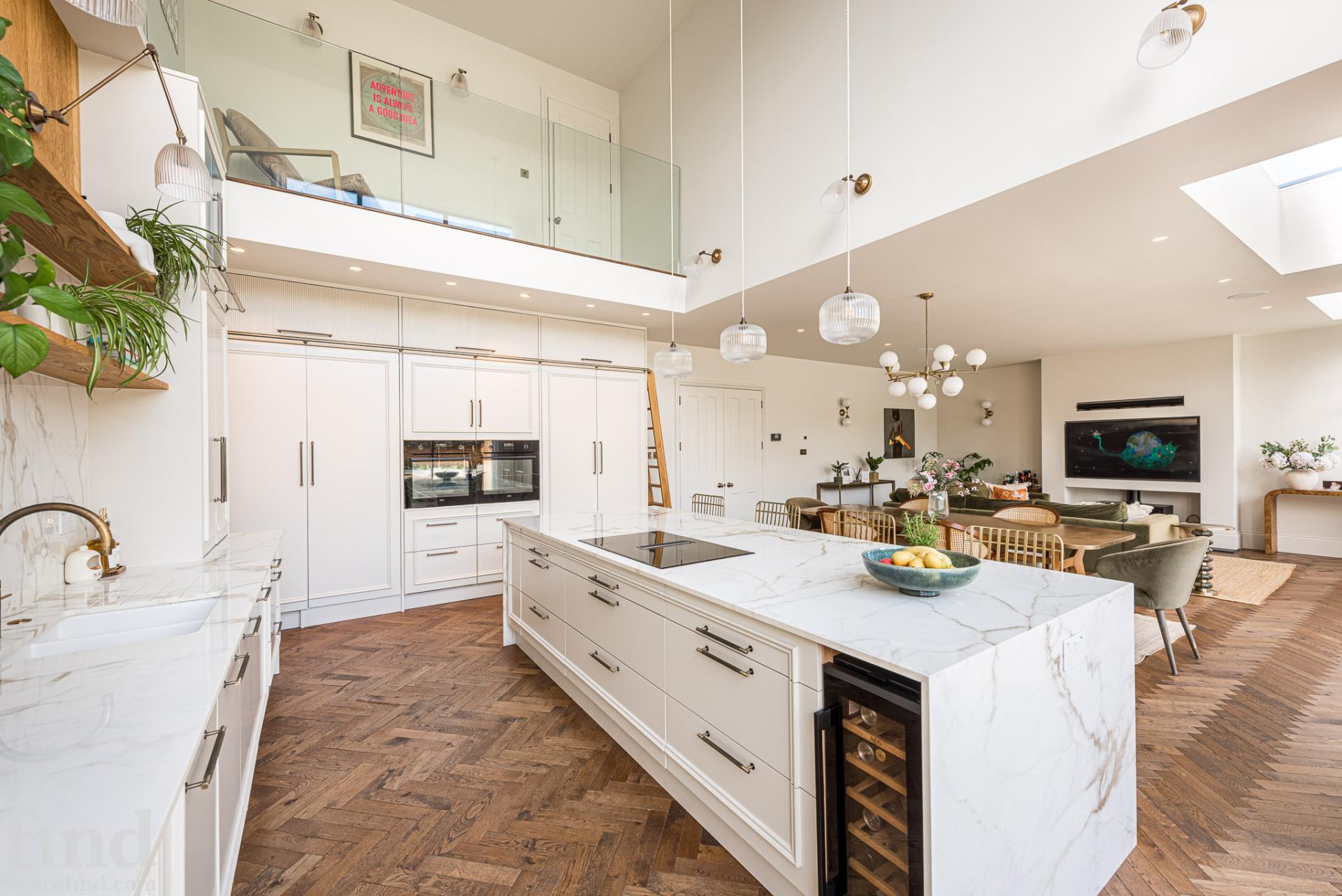 Double height, marble kitchen and balcony.